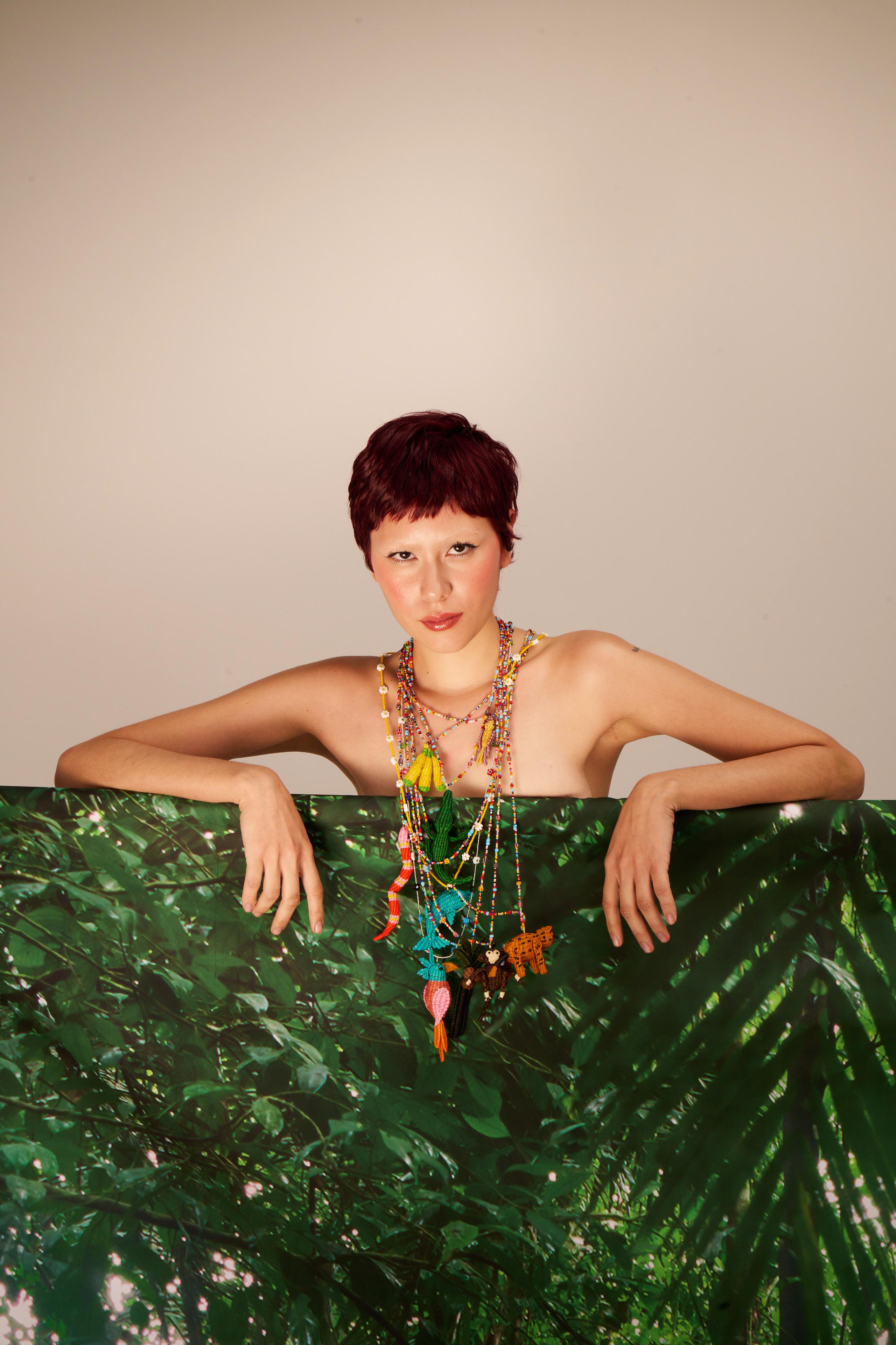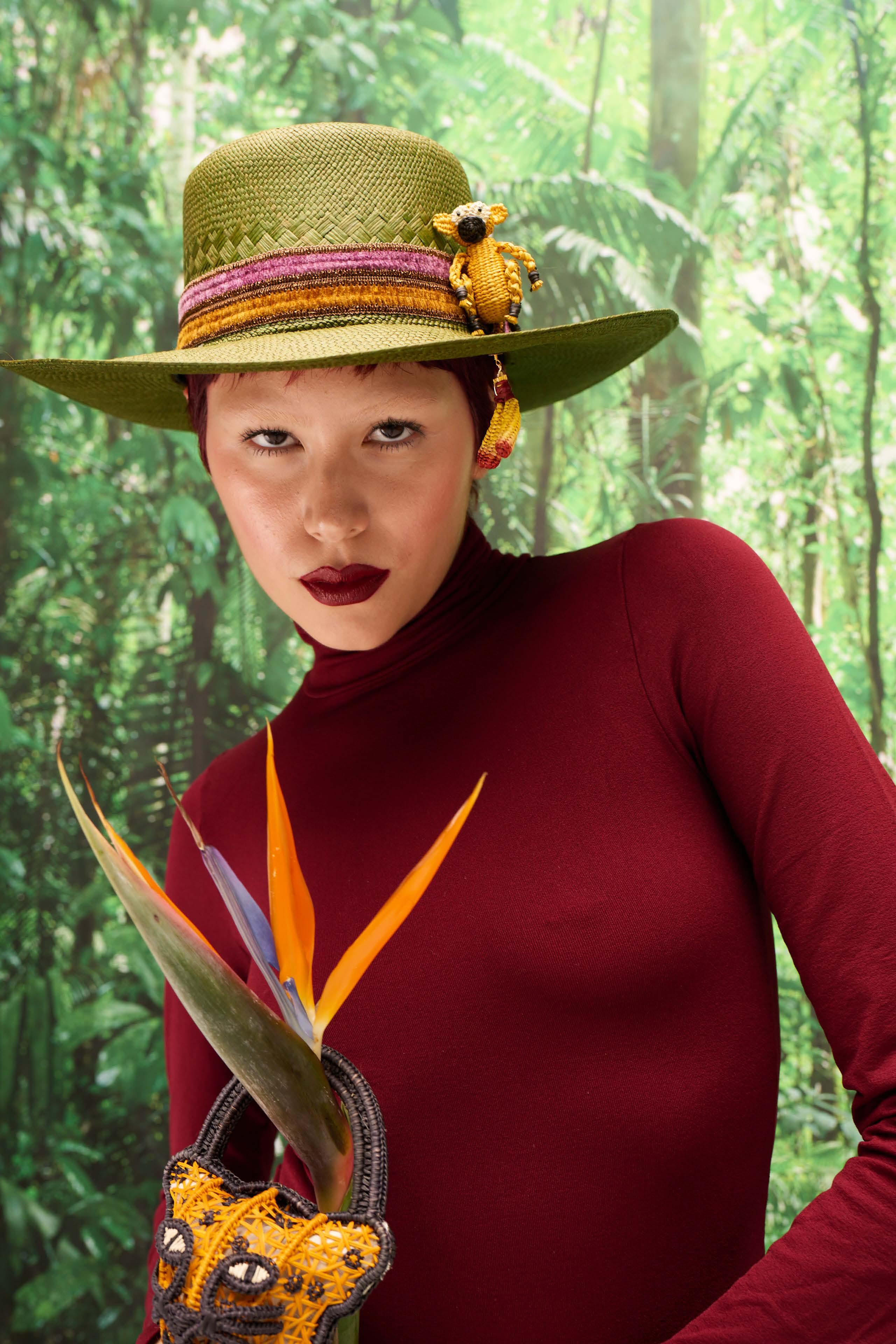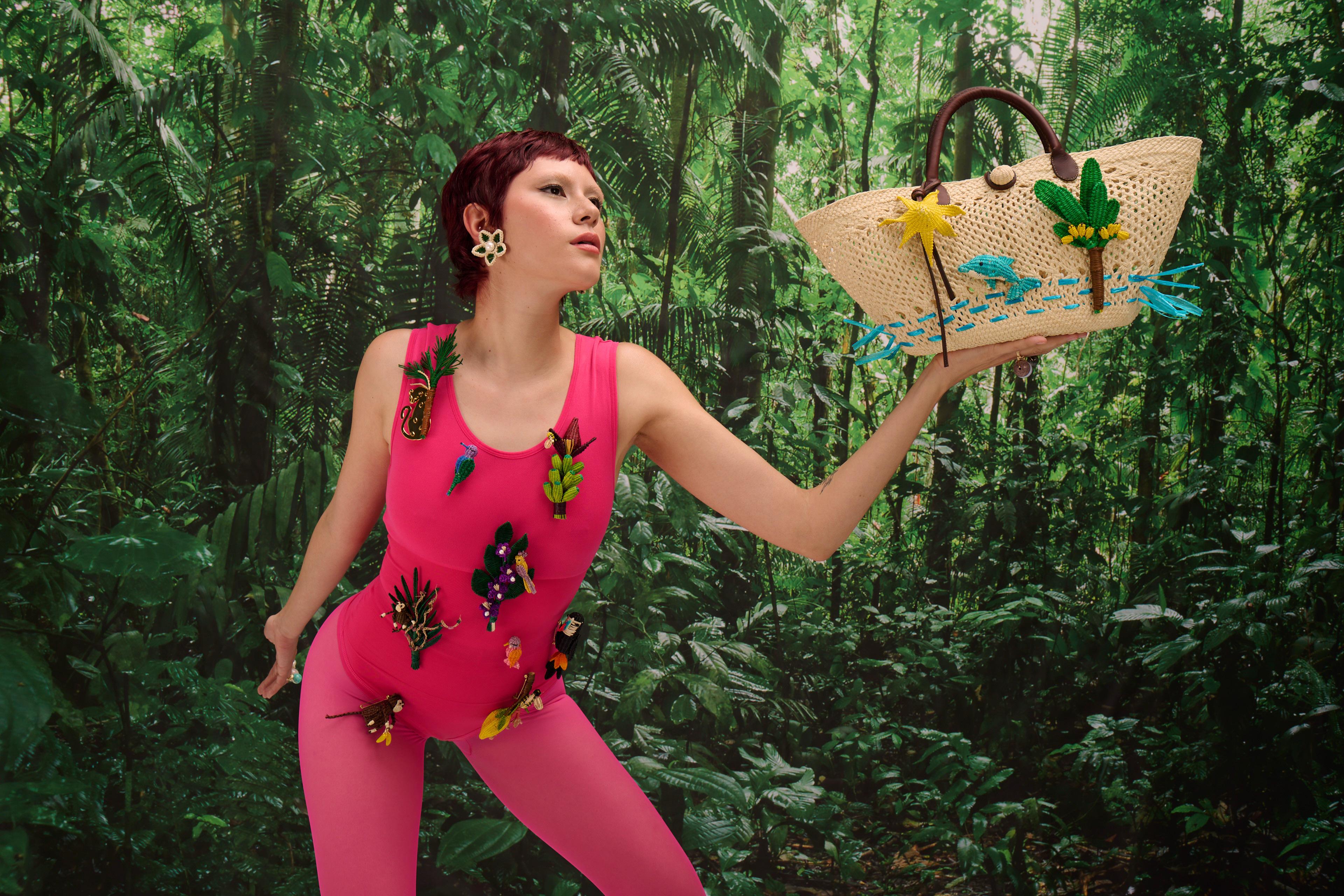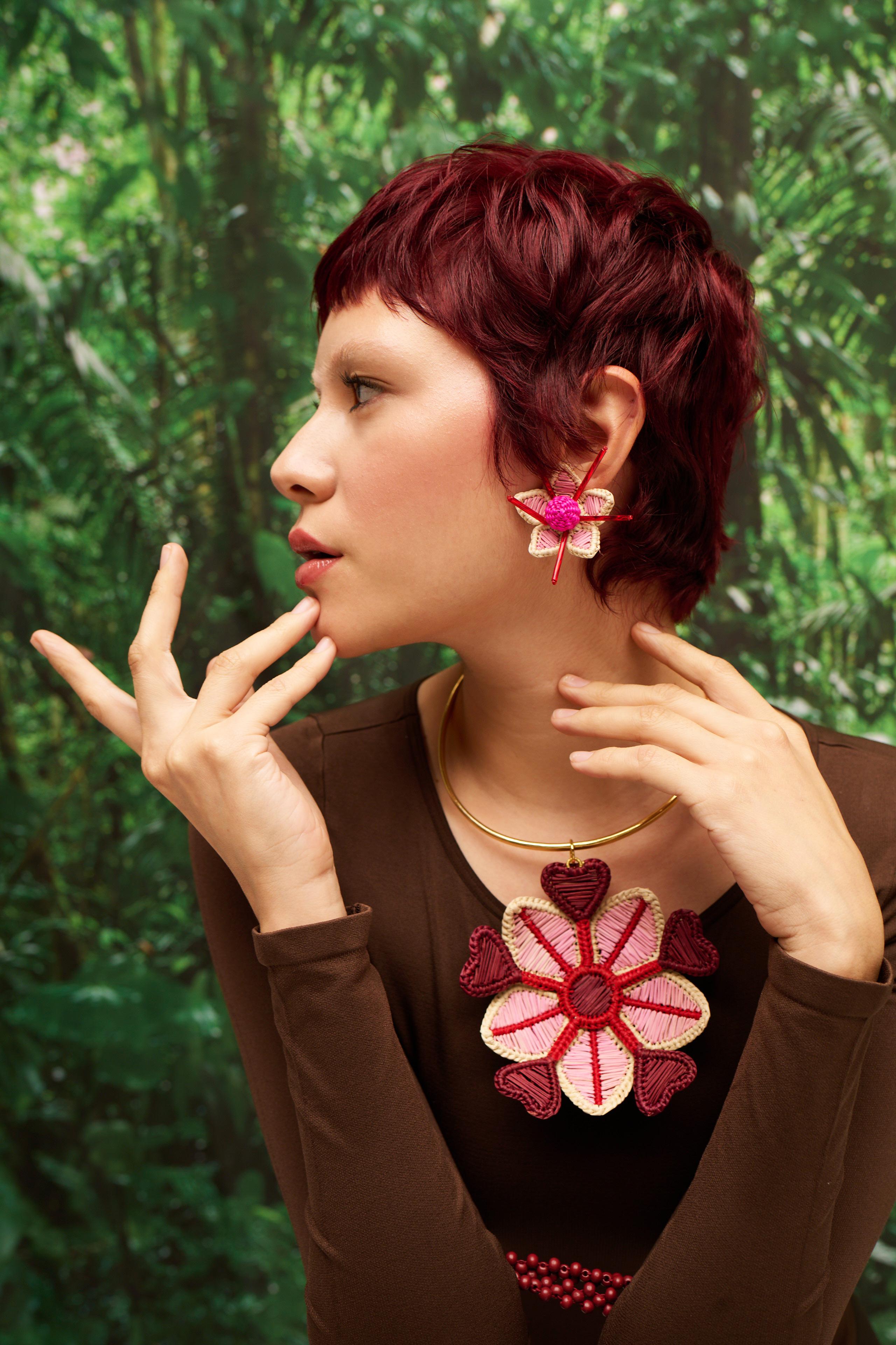 A river of colors runs through the forest, and hands weave what the earth whispers. From the heart of Colombia, the forest speaks through our hands. Raffia, crystals, semiprecious stones, gold-plated bronze, and feathers become vessels of its memory. Every piece is crafted in community, carrying the wisdom of generations. In these creations, the Amazon reveals itself- the playful monkeys, the call of fantastic birds, the jaguar’s silent power, the blue branch with black dots,the blossoms of copoazú and banana.We created earrings that dance with you and sway with the wind, necklaces filled with meaning and power, bags to hold your treasures, and handwoven baskets that carry our story in every knot. They carry the soul of the jungle—untamed, radiant, eternal. May you listen to these whispers and let the Amazon speak through you.