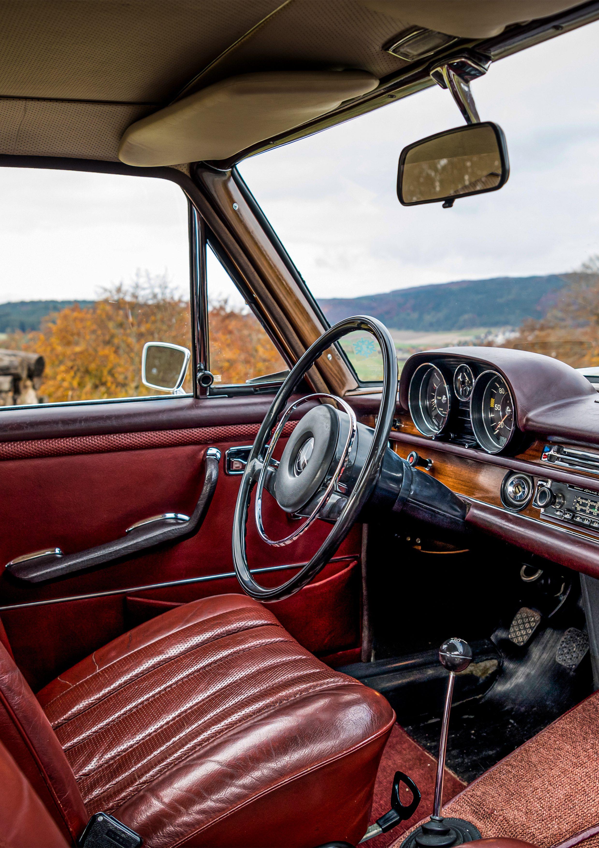 The 450 SEL 6.9 comes with very extensive standard equipment. Air conditioning, central locking, cruise control, power windows, headlamp cleaning system, velour upholstery and inertia-reel seat belts for all seats are included – features that are by no means standard in most other models in 1975.