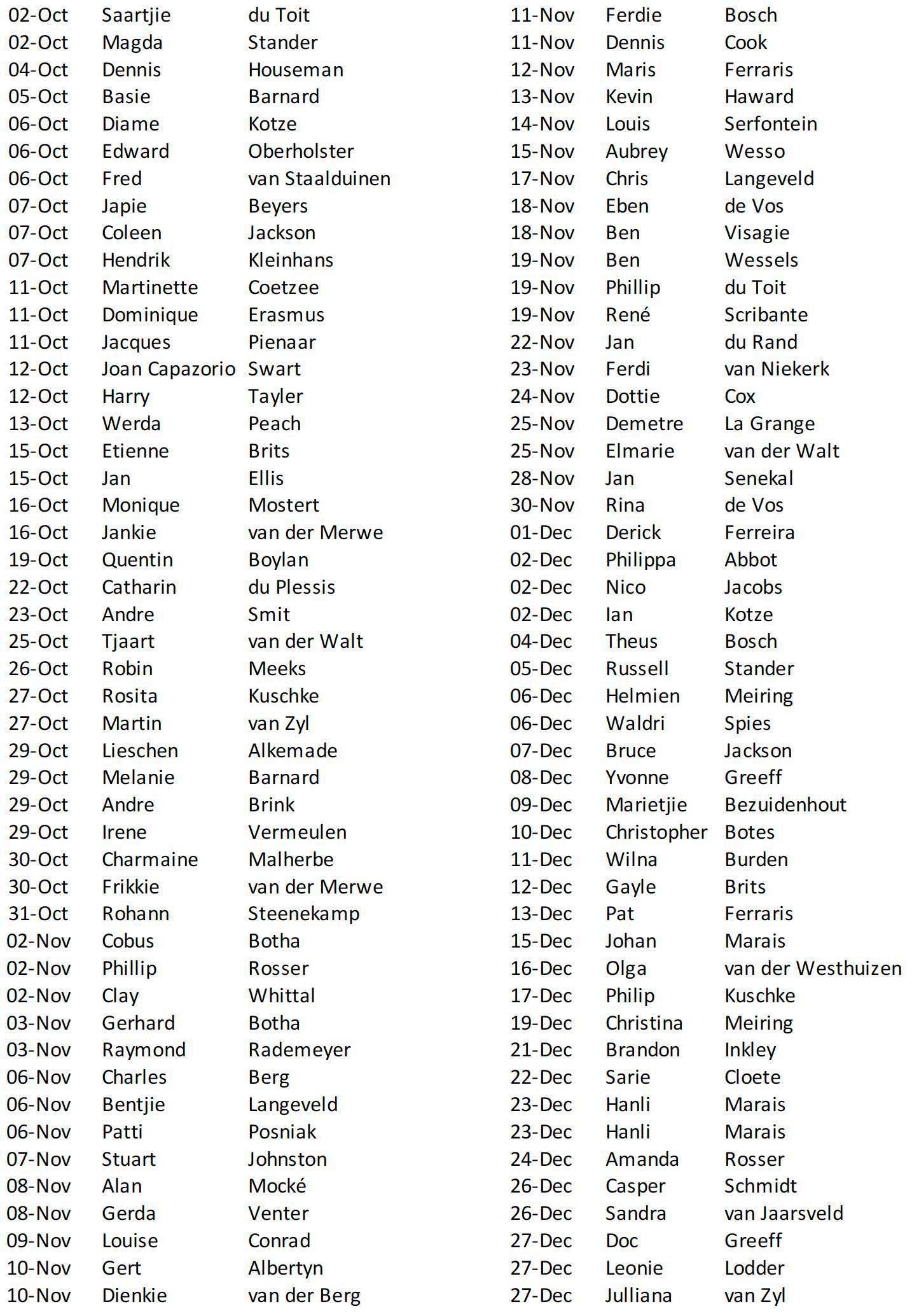 Ons wens die volgende lede ‘ n gelukkige verjaarsdag en ‘ n gesonde jaar toe. We wish the following members a happy birthday and a healthy year: