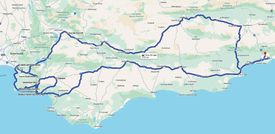 Na middagete: Vertrek na finale bestemming The Windsor Hotel, Hermanus via Clarence-rylaan