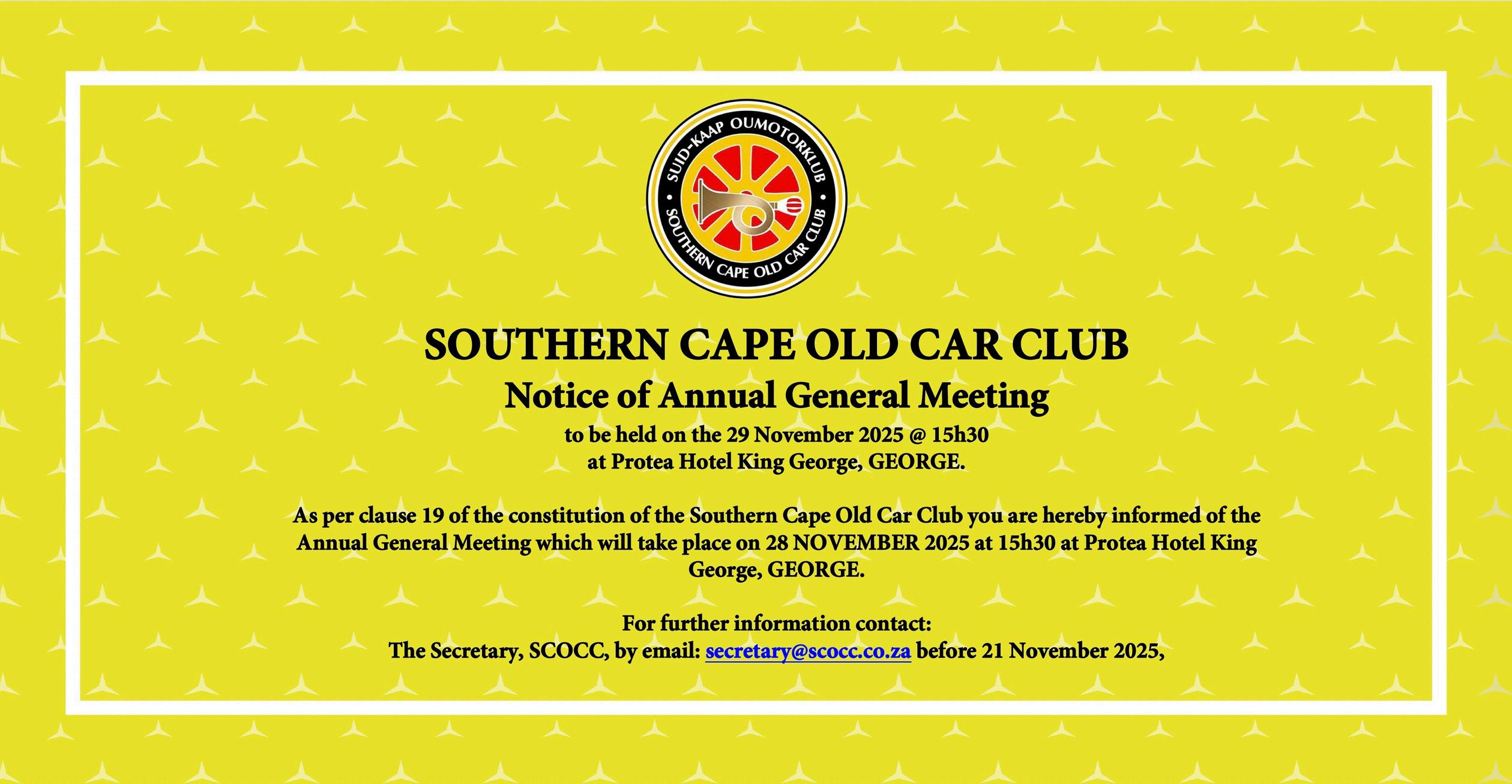 As per clause 19 of the constitution of the Southern Cape Old Car Club you are hereby informed of the Annual General Meeting which will take place on 28 NOVEMBER 2025 at 15h30 at Protea Hotel King George, GEORGE.