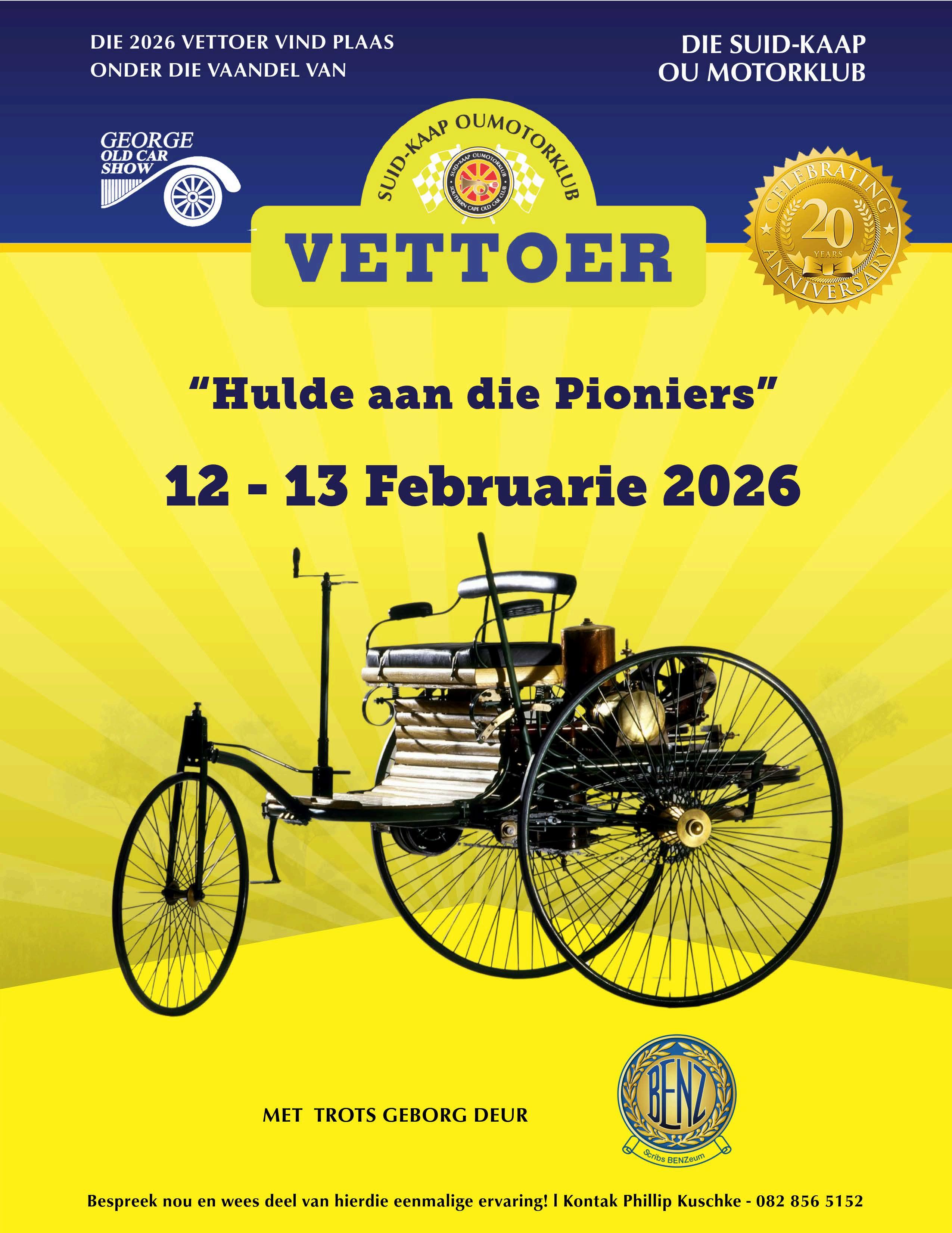 The 29th George Old Car Show – Saturday, 14 February 2026 Next year’s theme celebrates The Pioneers of Motoring, and we’re planning a standout display featuring BENZ history and heritage We are also celebrating the 20th Vettoer, and aiming to bring as many early veteran vehicles to the show. Trust me, you’re going to want to be part of it.