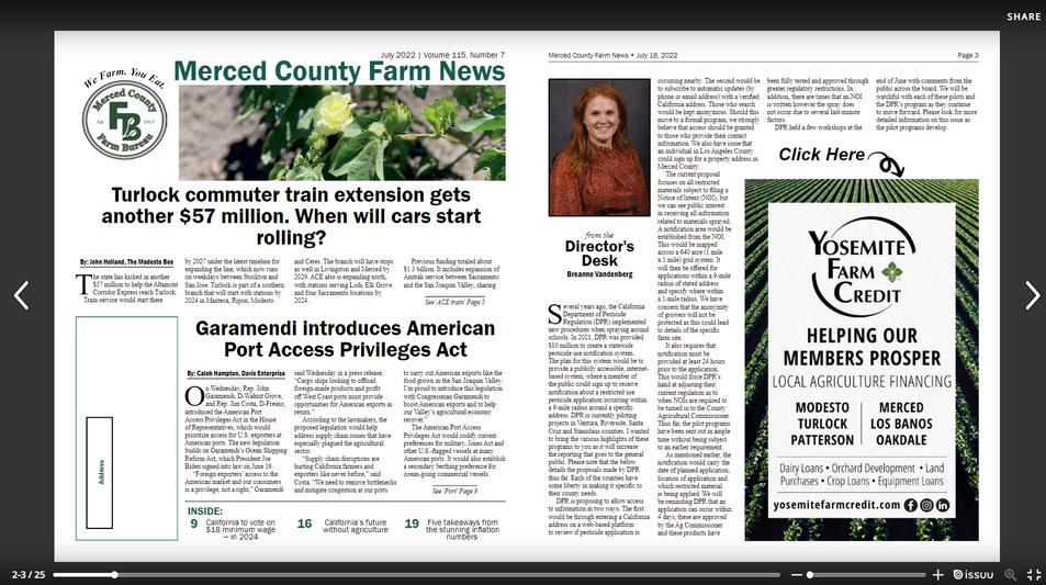 For all inquiries and questions regarding advertising or billing with Merced County Farm Bureau, please contact Denelle. CONTACT DENELLE FLAKE FARM NEWS EDITOR dflake@mercedfarmbureau.org (209) 723-3001