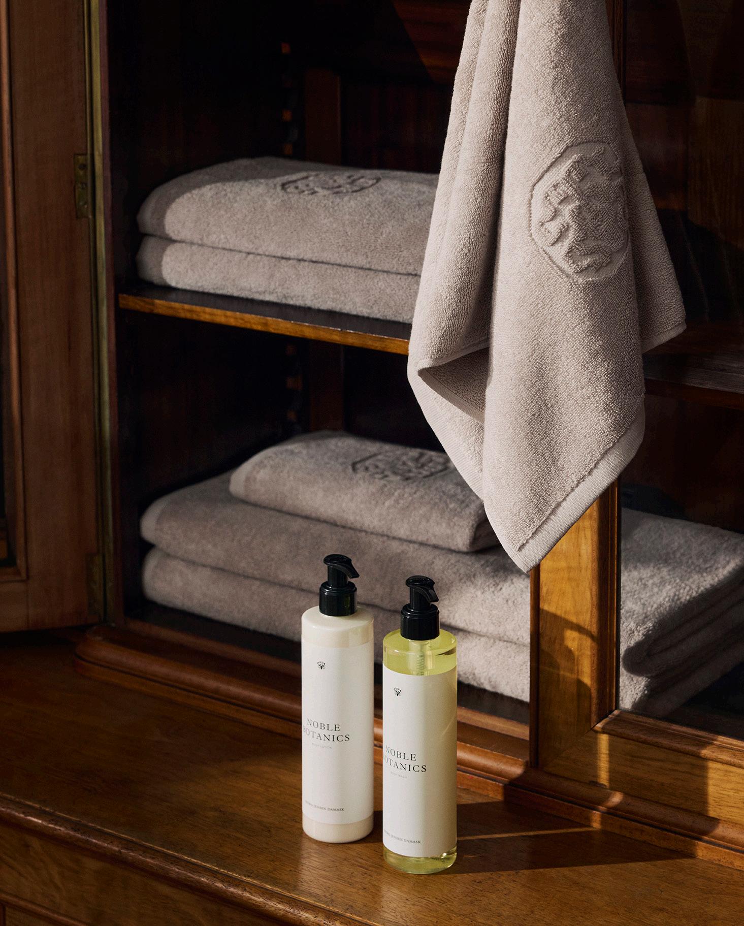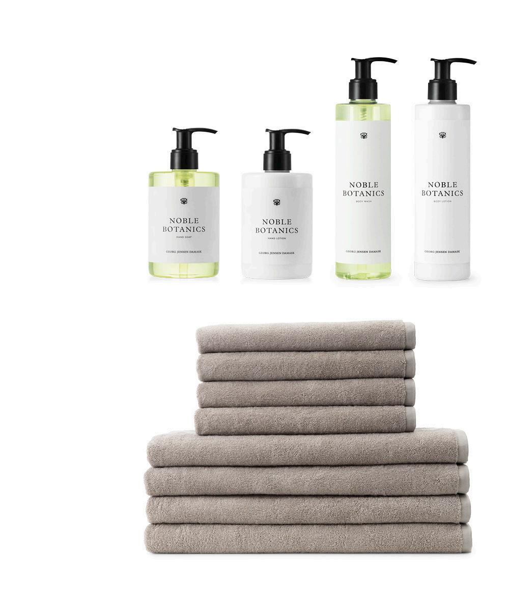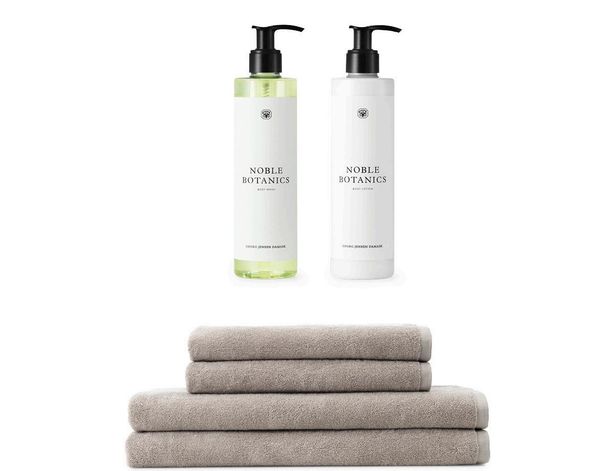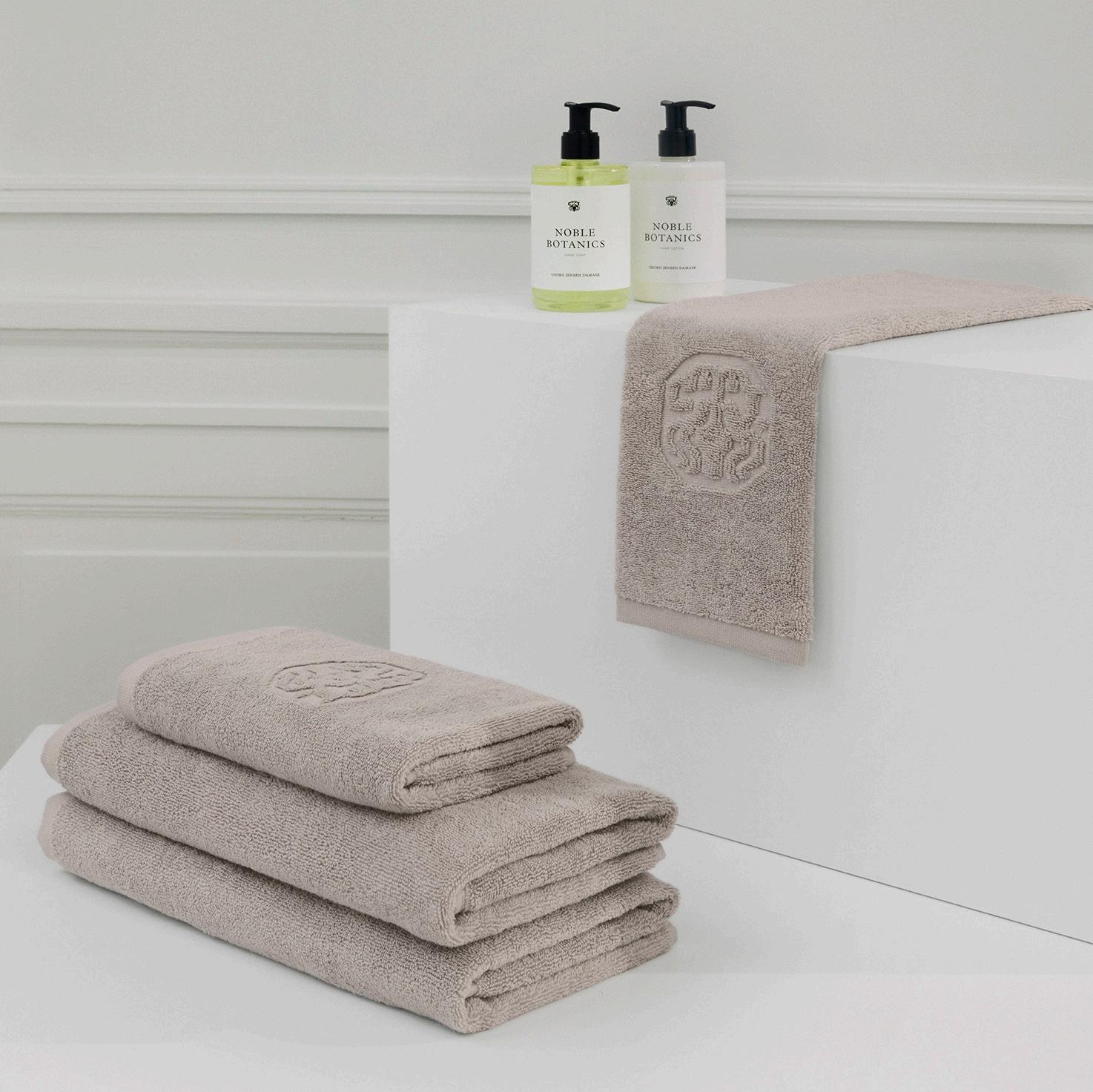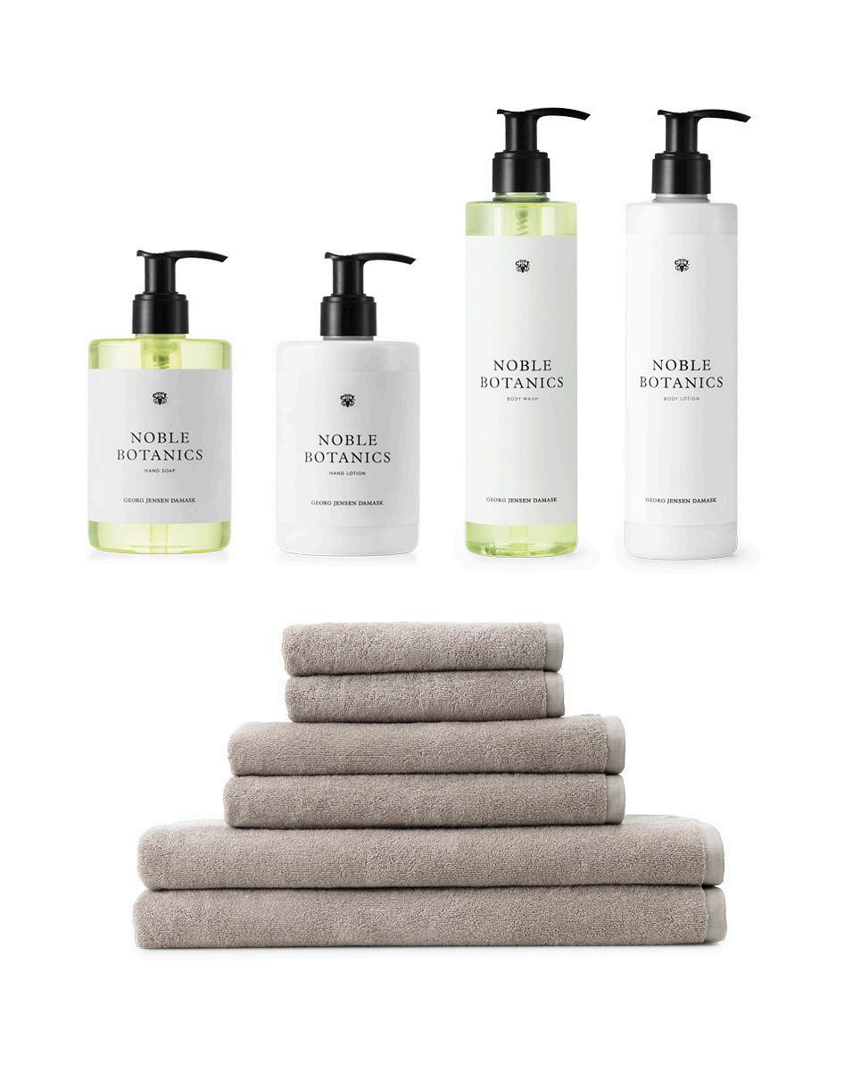 Georg Jensen Damask håndklæde & sæbe 2 stk 40x70 cm, 2 stk 50x100 cm & 1 stk Botanic håndsæbe i Taupe
