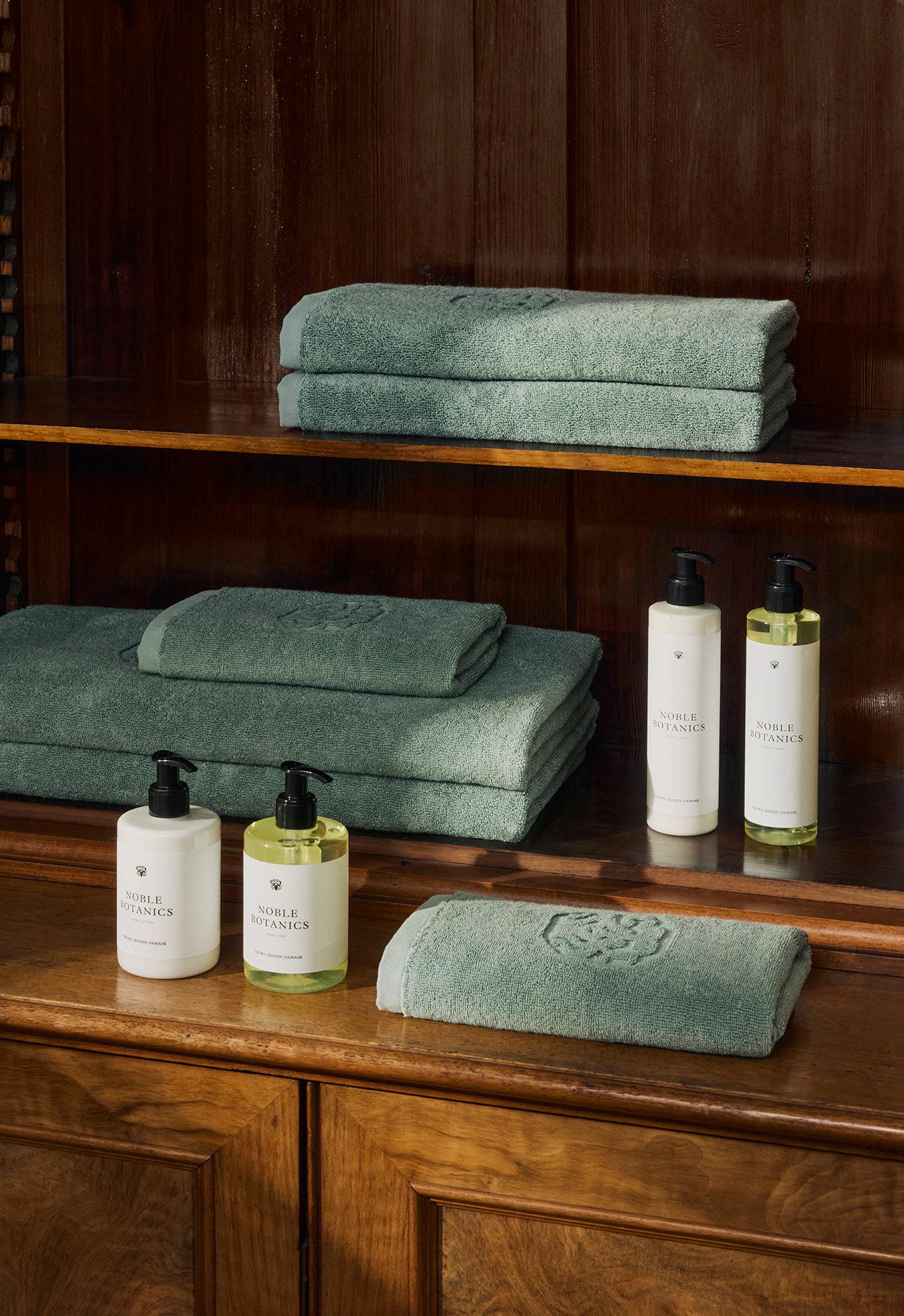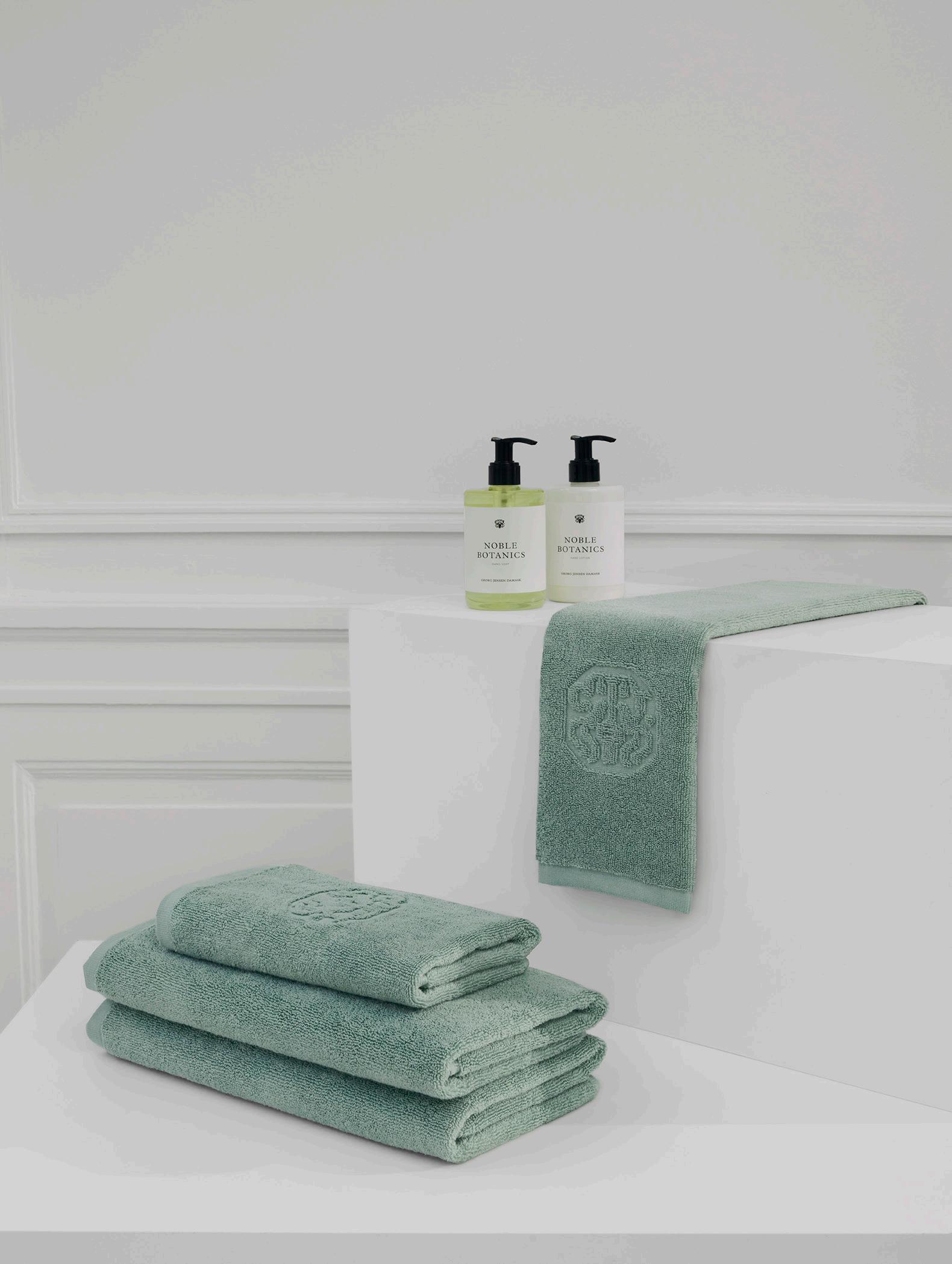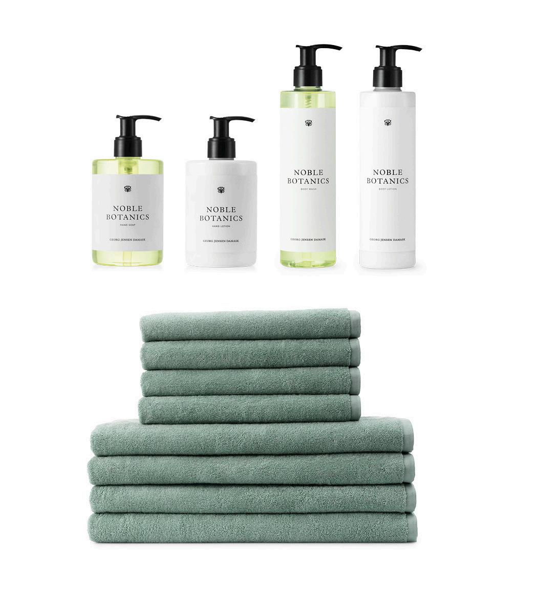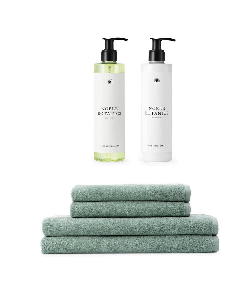 Georg Jensen Damask håndklæde & sæbe 2 stk 40x70 cm, 2 stk 50x100 cm & 1 stk Botanic håndsæbe i Sage Green