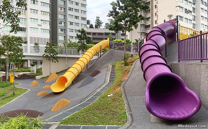 The highlight of this big playground is these long tube slides! do observe the shapes of these slides carefully!