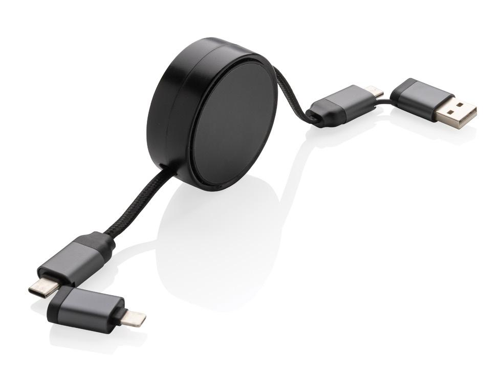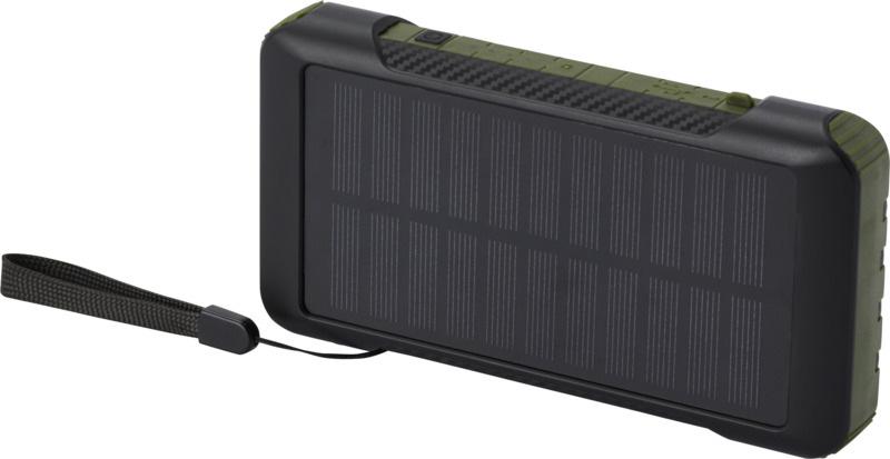 Soldy powerbank med 10 000 mAh, RCSåtervunnen plast. Perfekt för utomhusaktiviteter med soldynamo och vevdynamo. Ladda via Type-C eller mikro-USB. Inbyggda kablar för Type-C, iOS, USB-A och mikro-USB.