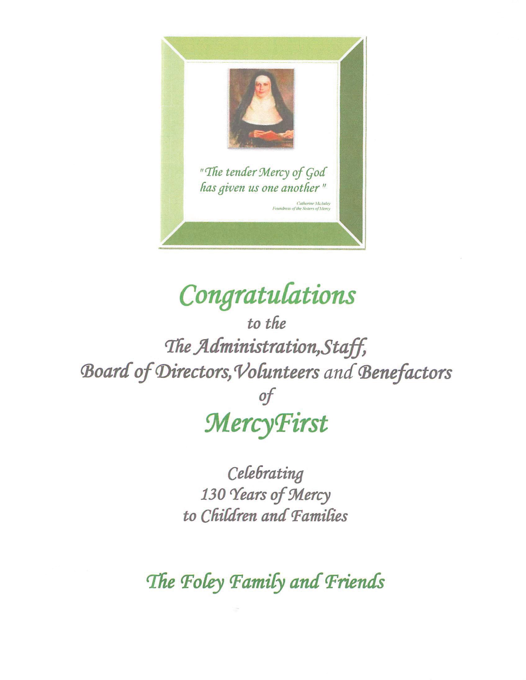 On the 130th year of merciful service to children, women and families, we honor and celebrate the Sisters of Mercy and their unfailing commitment to Compassion, Excellence, Hospitality, Integrity, Justice and Respect.