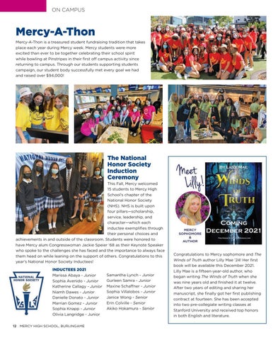 This Fall, Mercy welcomed 15 students to Mercy High School’s chapter of the National Honor Society (NHS). NHS is built upon four pillars—scholarship, service, leadership, and character—which each inductee exemplifies through their personal choices and achievements in and outside of the classroom. Students were honored to have Mercy alum Congresswoman Jackie Speier ‘68 as their Keynote Speaker who spoke to the challenges she has faced and the importance to always face them head on while leaning on the support of others. Congratulations to this year’s National Honor Society Inductees! INDUCTEES 2021 Marissa Abaya - Junior Sophia Avenido - Junior Katherine Callagy - Junior Niamh Dawes - Junior Danielle Donato - Junior Marrian Gomez - Junior Sophia Knapp - Junior Olivia Langridge - Junior 12 MERCY HIGH SCHOOL, BURLINGAME