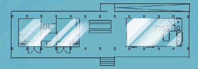 The light permeates a majority of the interior spaces through large southern facing windows and doors.