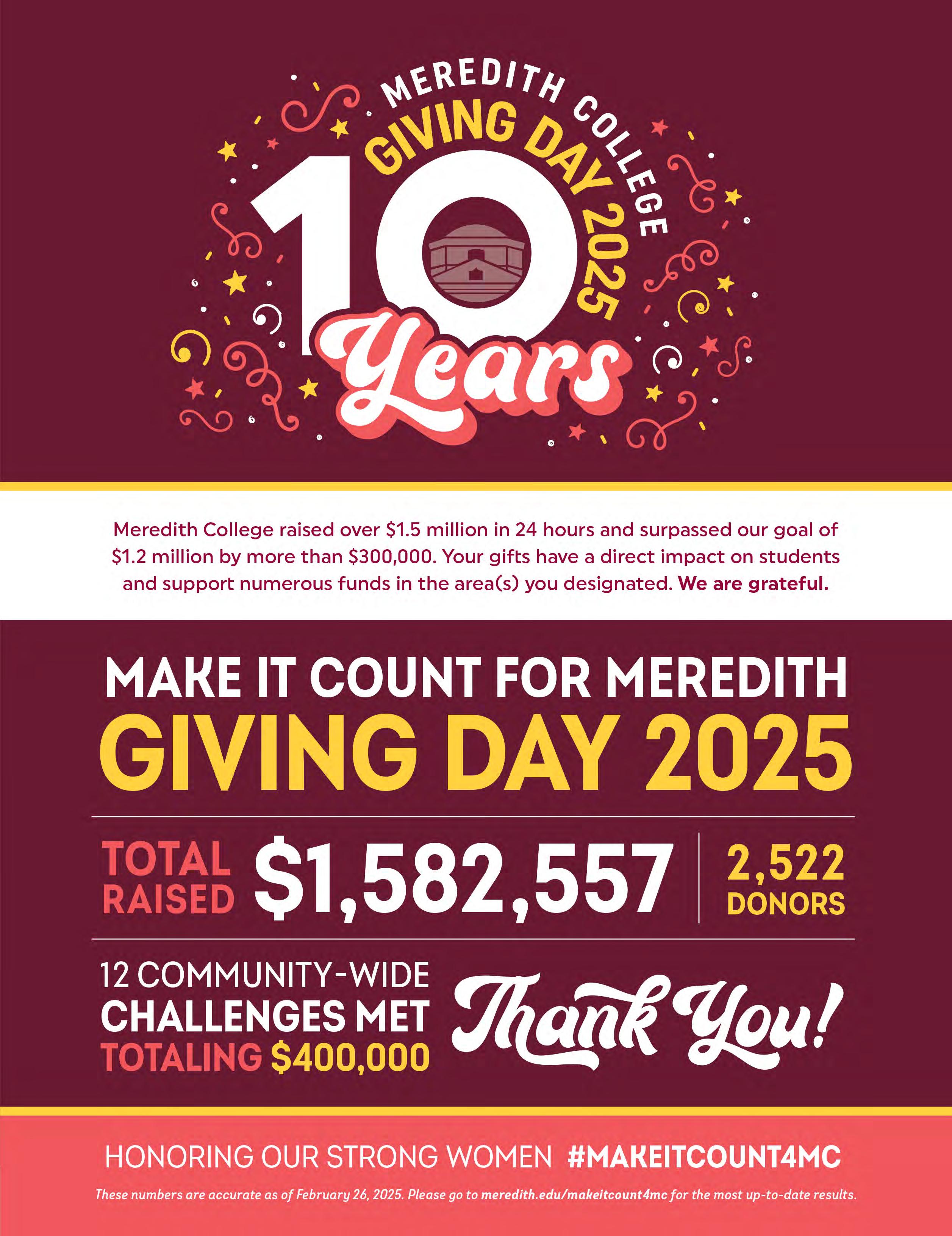 As the spring semester began, Meredith College welcomed new and returning students to campus. Just as its beautiful 225-acre location in Raleigh is a strength, so is Meredith’s ability to adapt to meet the needs of current students. Read about ways that Meredith offers innovative student support in the feature on page 18.
