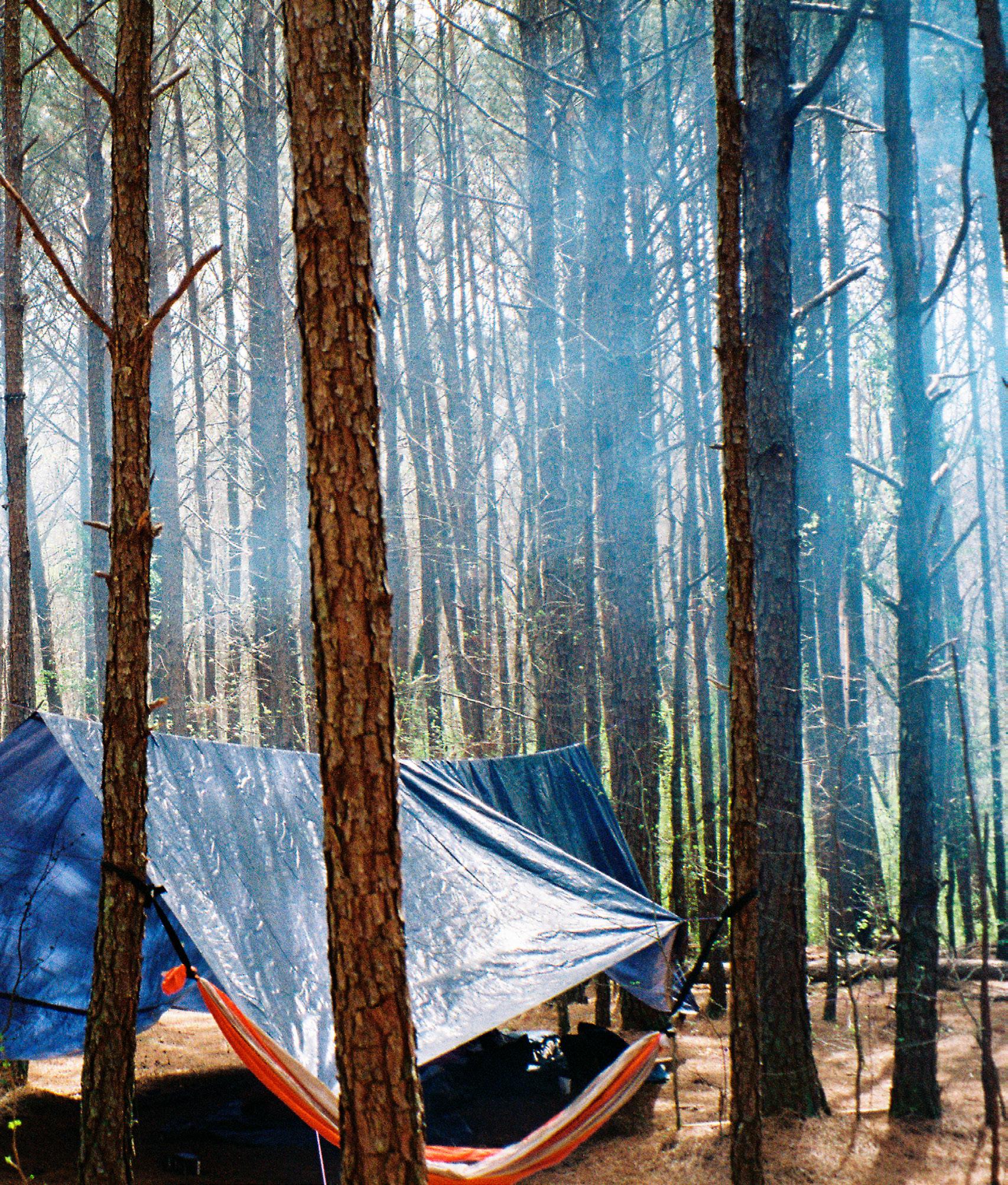 Hundreds of people poured into the forest: anarchists, environmentalists, abolitionists, and other direct action-oriented groups bringing tents, hammocks, sleeping bags, and food. Some arrived prepared to operate a field kitchen. Small encampments emerged everywhere, some adopting names for themselves. Clusters of tents and canopies appeared in a patchwork on both sides of the South River—some organized by affinity group, others by chance. It is difficult to take a head count in the forest, as the opponents of the movement have probably also noticed. The kitchen crews estimated that a minimum of 200 people were sleeping in the forest at night; on some days, considerably more people joined the occupation.