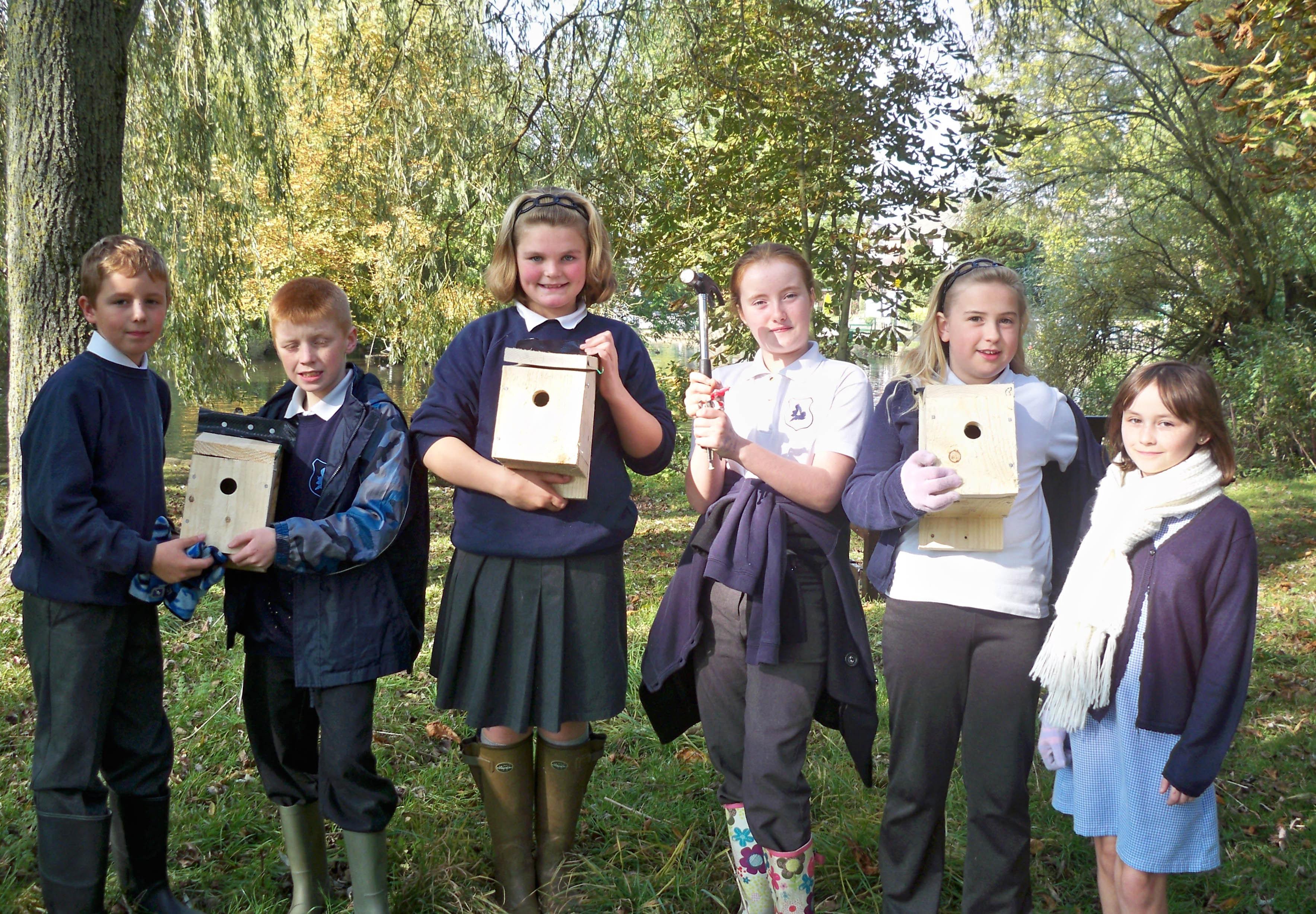 Pupils from Meriden Primary School proudly showing off the bird boxes built by their Eco Club, with the help of the Park Rangers, who fixed them to the trees surrounding the duck pond.