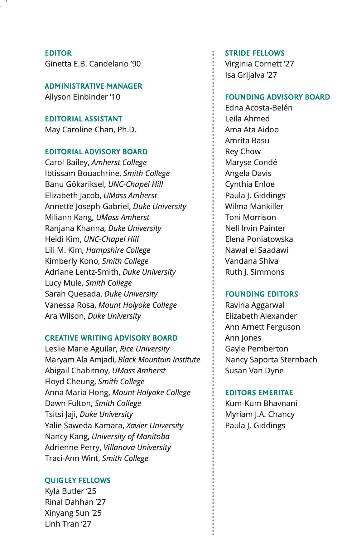 Published in the fall of 2000, the frst issue exemplifed the innovative contributions Meridians would go on to make, from including creative writing, activists’ reports, testimonios, and experimental work alongside conventional research-based scholarship. The primary commonality of these features lies in their commitment to showcasing transnational women of color feminist and anti-racist knowledge production in all its glorious, innovative diversity. As President Simmons put it, “Women of color have many histories, and these histories can be brought into full and useful relief by providing opportunities for these women to speak for themselves.” That is what Meridians has done and will continue to do into the future, thanks to the home that Smith College has continued to provide for this work, to the generosity of alumnae donors who funded an endowment to support our work in perpetuity, and to the alum scholars, artists, activists, and achievers who have contributed to the Meridians project’s success.