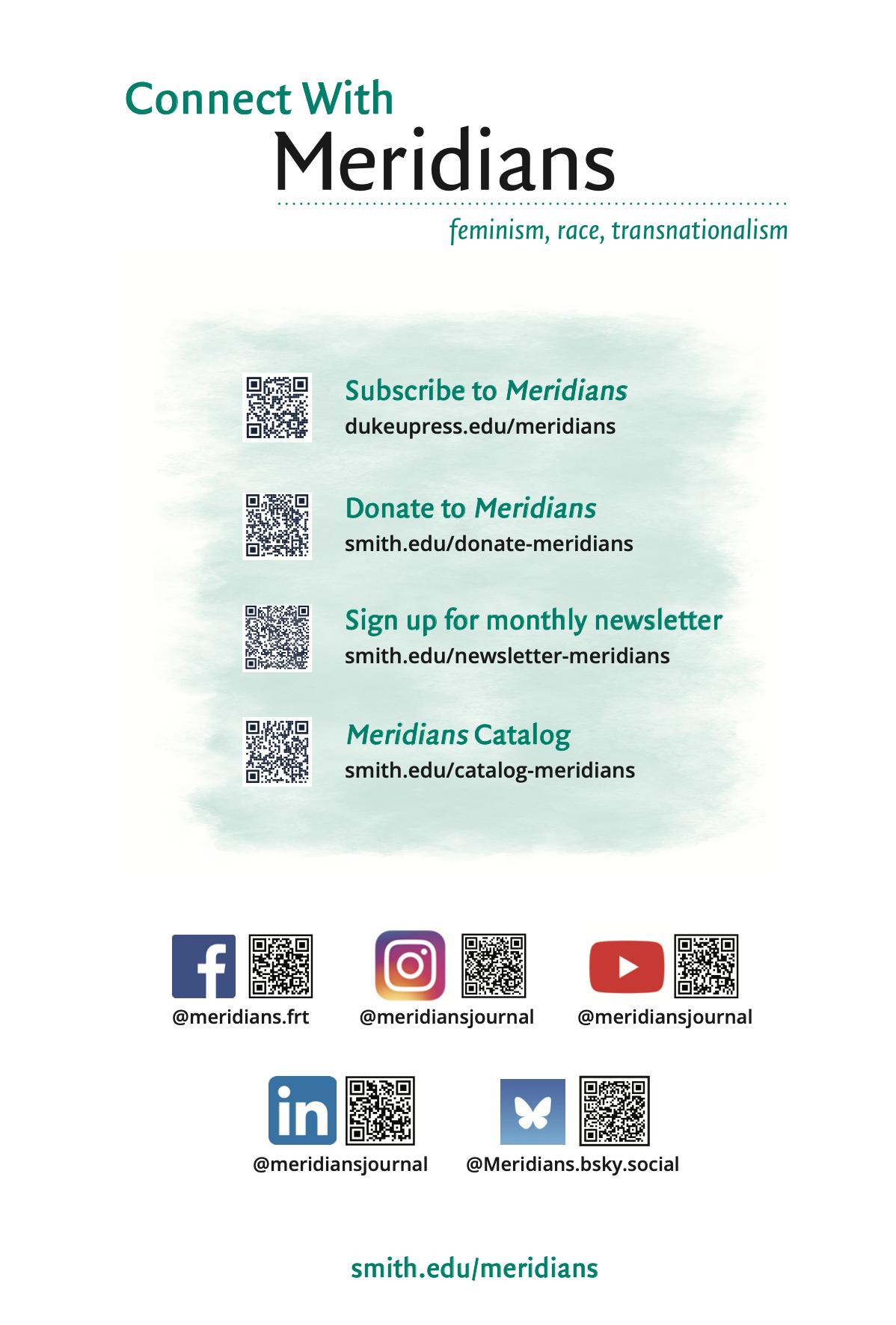 From a nascent idea to a cornerstone of intersectional transnational feminist thought, Meridians has launched, built, and shaped cutting-edge scholarship and creative work for 25 years. Moments like this—to refect on the challenges and savor the successes that come from such deep collaboration—are particularly important. The searing and searching essays and poetry, the evidence-based scholarship, and the radically inclusive vision advanced in the pages of Meridians ofer a trenchant intervention and antidote to the domestic chaos and global upheaval under which so much of the planet’s people live and with which Meridians contributors have always engaged.