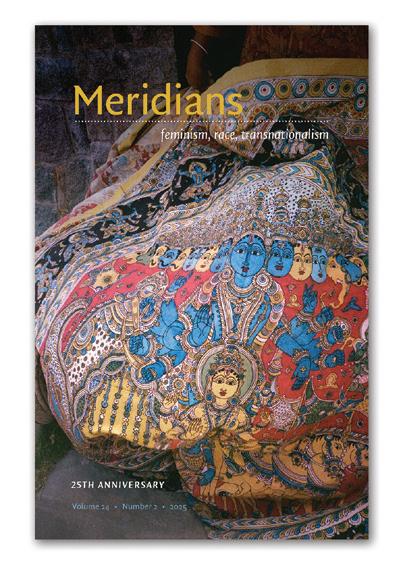 I also invite you to join us—in person or virtually—when we celebrate Meridians: feminism, race, transnationalism with a 25th Anniversary Symposium to be held at Smith College, October 24 to 25, 2025. This two-day event will open with a dinner in honor of our founders, our editors emeritae Kum-Kum Bhavnani and Paula J. Giddings, and our lead champions on campus—President Sarah Willie-LeBreton and Provost and Dean of the Faculty Daphne Lamothe. The second day will be devoted to showcasing the contributions of 17 Meridians activists, artists, poets, and scholars, who will speak about their work and the role Meridians has played in their felds and professional lives.