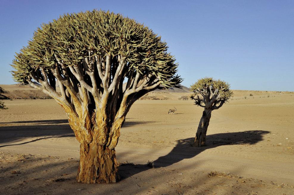 De kokerboom (Aloe dichotoma) is geen boom in de engere zin van dat woord, maar een plant van het geslacht Aloë, die uitgroeit en vertakt tot hij de proporties van een flinke knotwilg heeft. Aloë's zijn een Afrikaans vetplantengeslacht waarvan slechts enkele tot bomen vormen. De kokerboom komt voor in erg droge streken in het noordoosten van de Karoo in Zuid-Afrika (onder andere bij Brandvlei) en het naburige zuiden van Namibië, onder andere in Speeltuin van de reuzen en het Kokerboomwoud bij Keetmanshoop. De naam kokerboom (Quivertree) is afgeleid van het feit dat de Bosjesmannen (San) de holle takken van de plant gebruiken om er pijlkokers van te maken. De eenzame Oryx (gemsbok) liep het beeld in toen ik deze foto aan het maken was.
