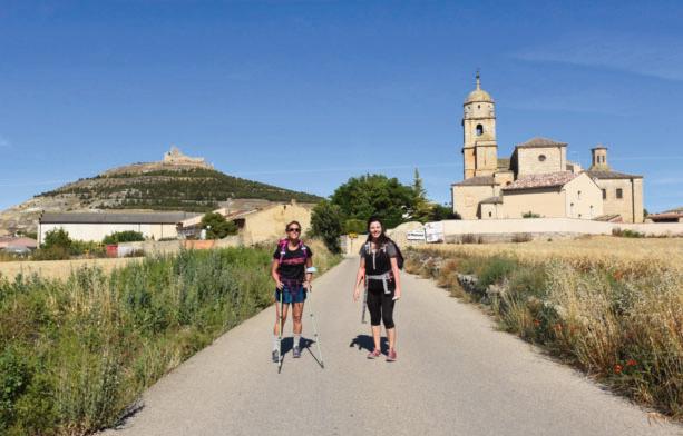 Linkerpagina van boven naar beneden Twee vrouwelijke pelgrims op de route Camino Frances; Stadspoort van de stad Sahagun met een ooievaar . Sahagun is een belangrijke doorgangs plaats op de pelgrims route naar Santiago de Compostella