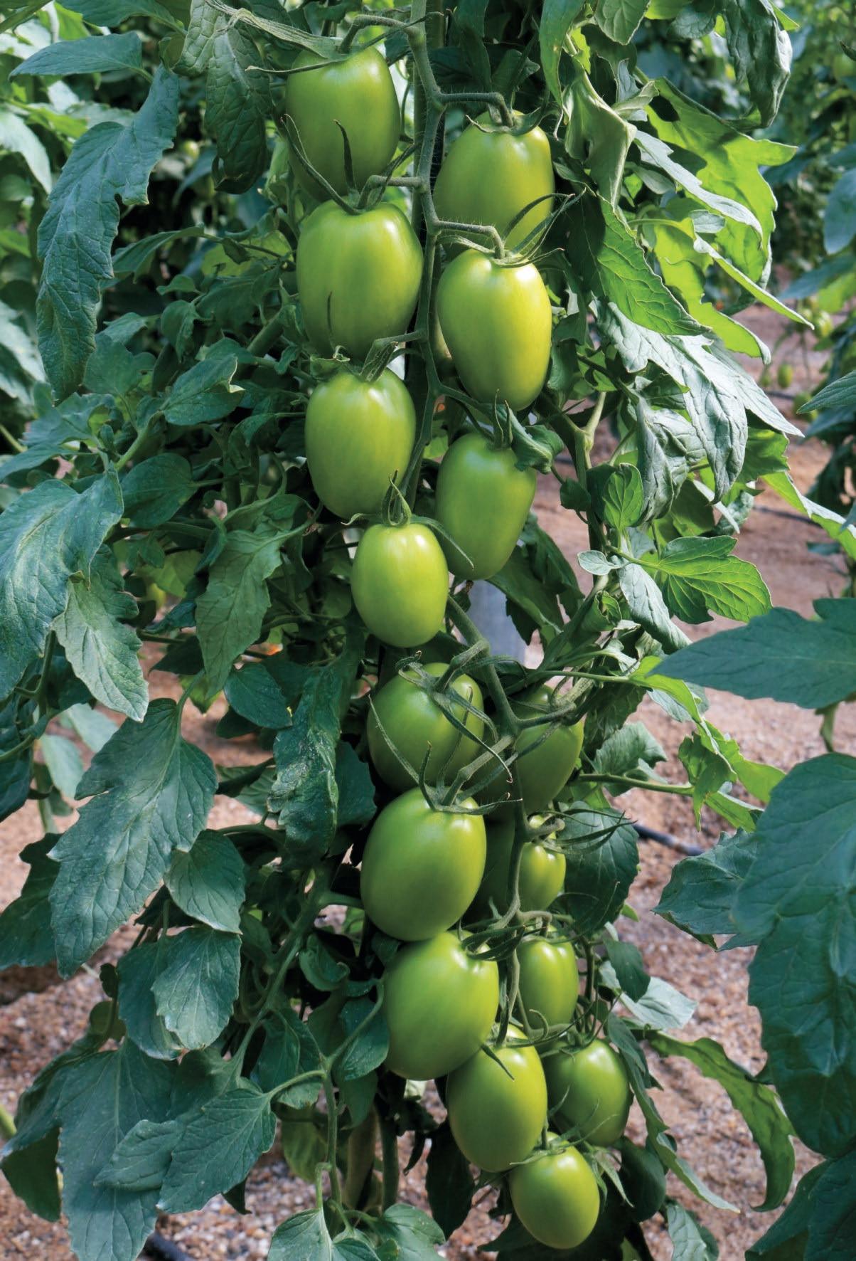 Híbrido de porte indeterminado de tipo Cocktail rama, de intenso cuello verde y maduración en chocolate. Apto también para recolección en suelto.