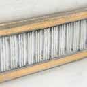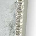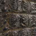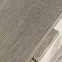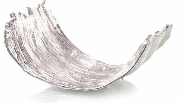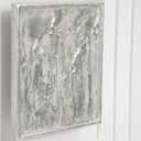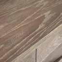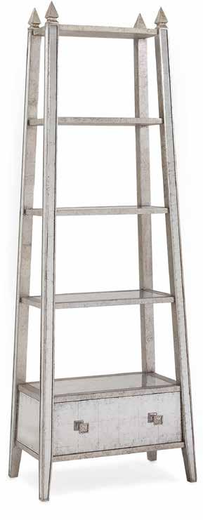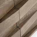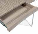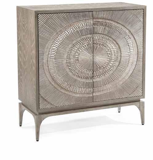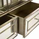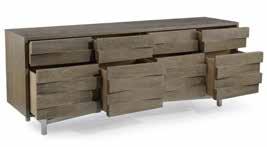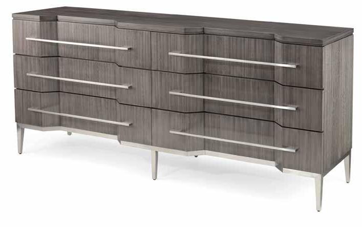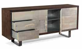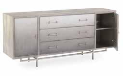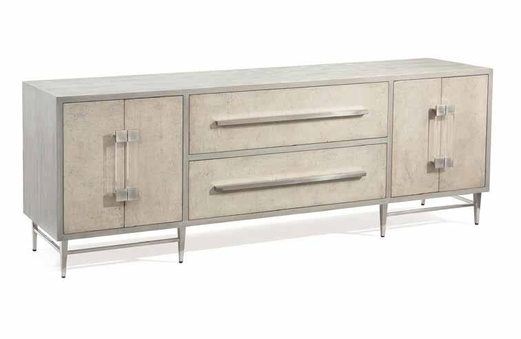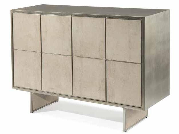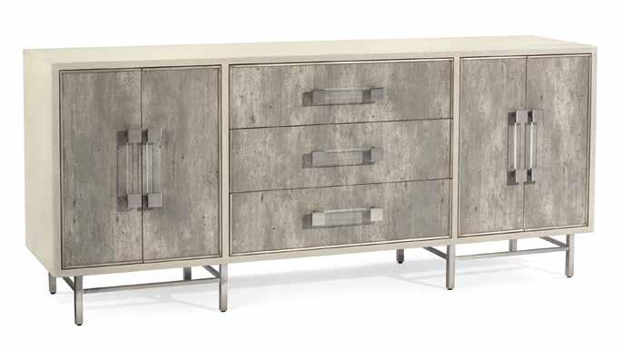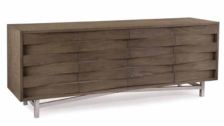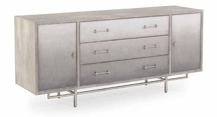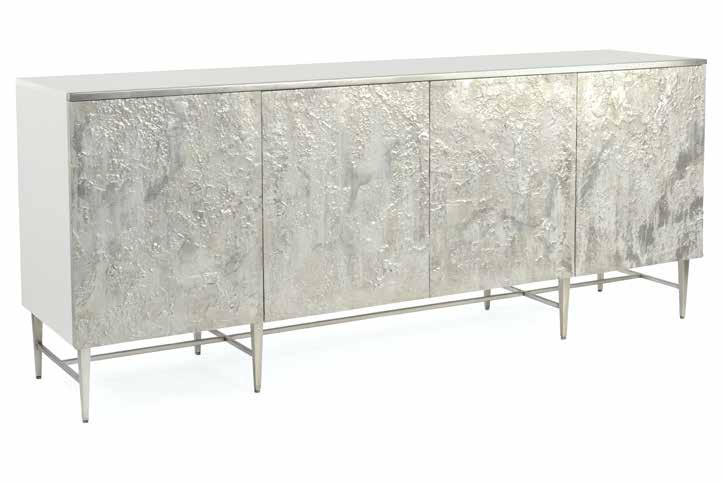 The Audley Sideboard in American white oak features center storage between two columns of three drawers each. The case is finished in driftwood and set on a base in brushed stainless steel. The entire front is finished in Truro silver leaf over a raised, textured pattern. Pushlatches are fitted to the doors and drawers, and a single adjustable shelf completes the interior.