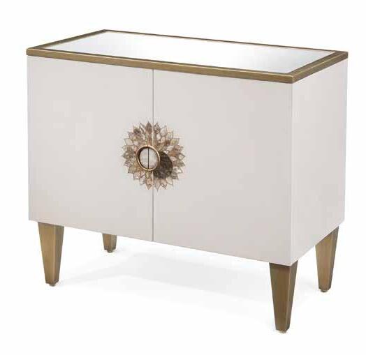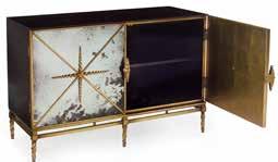 The front of this two-door cabinet features a mirrored print of an exotic crotch veneer in black and white, framed in a chamfered molding of brushed brass. The case is finished in beluga white. It is set on a steel base in brushed brass, with finger pulls to match. The doors are fitted with soft-closing hinges, and a single adjustable shelf completes the interior.