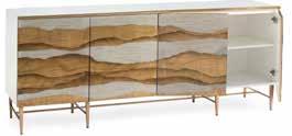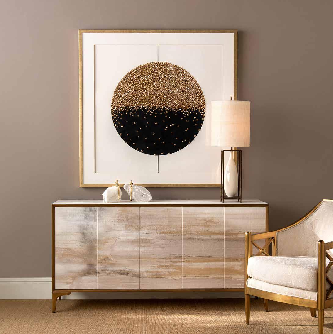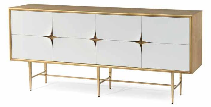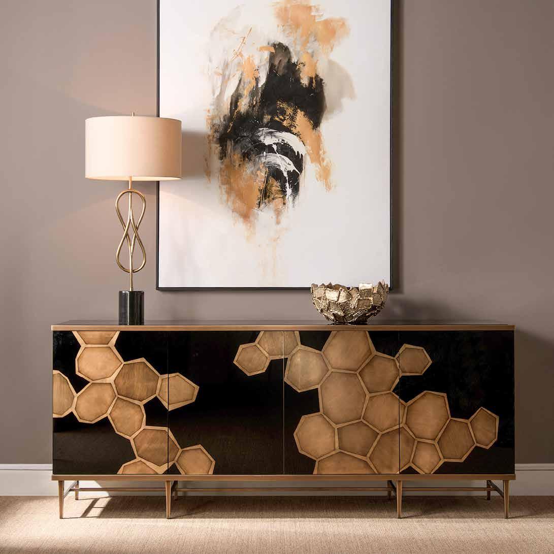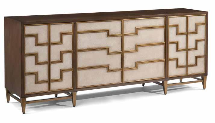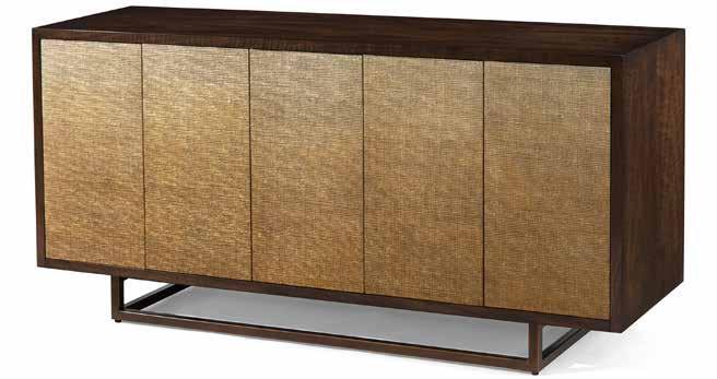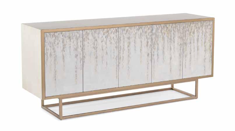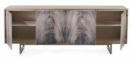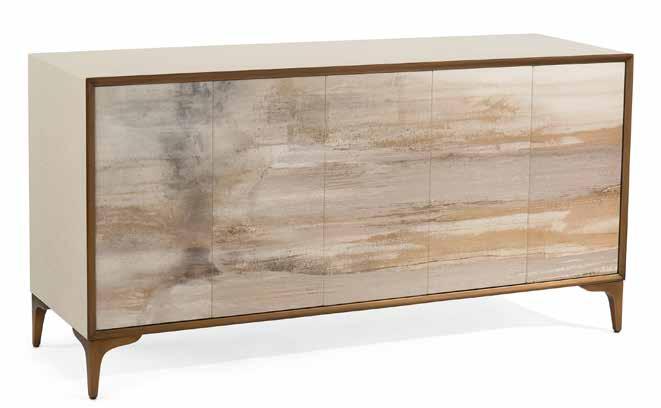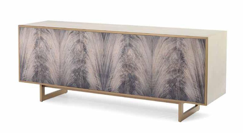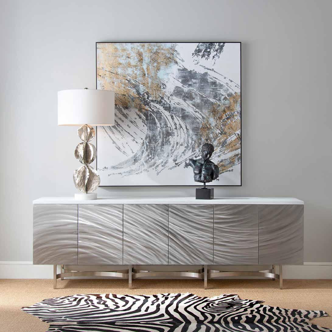 The Solstice Sideboard features a detail from the original work printed on burlap across the five door fronts. The case is inlaid and finished in white linen, and an inwardly chamfered molding in Mayan gold frames the printed front. The cabinet stands on four aluminum bracket feet finished in Mayan gold. There is an adjustable shelf behind the doors.