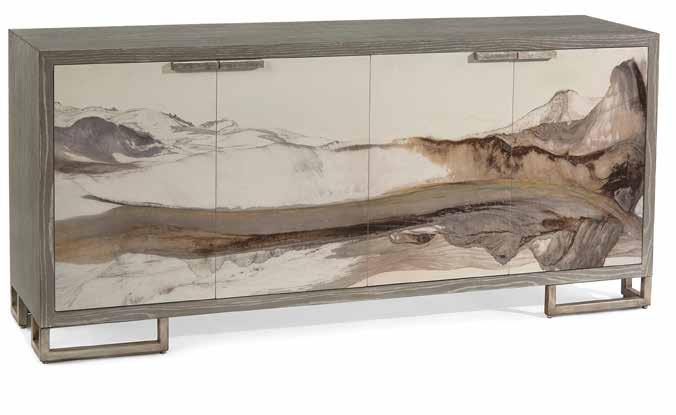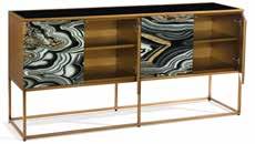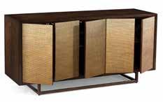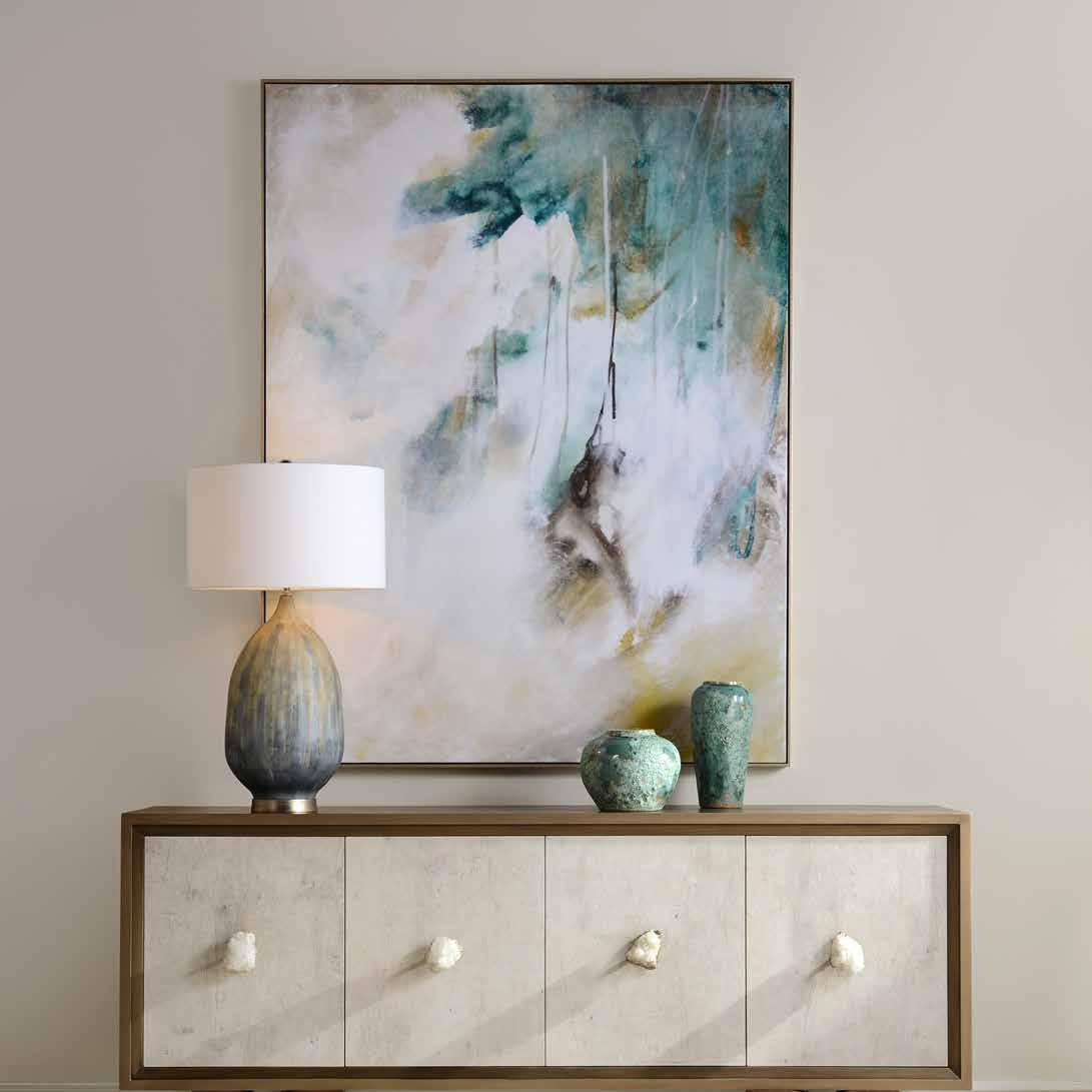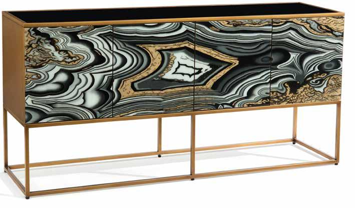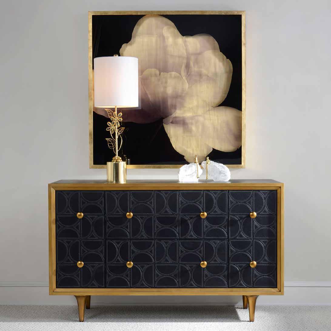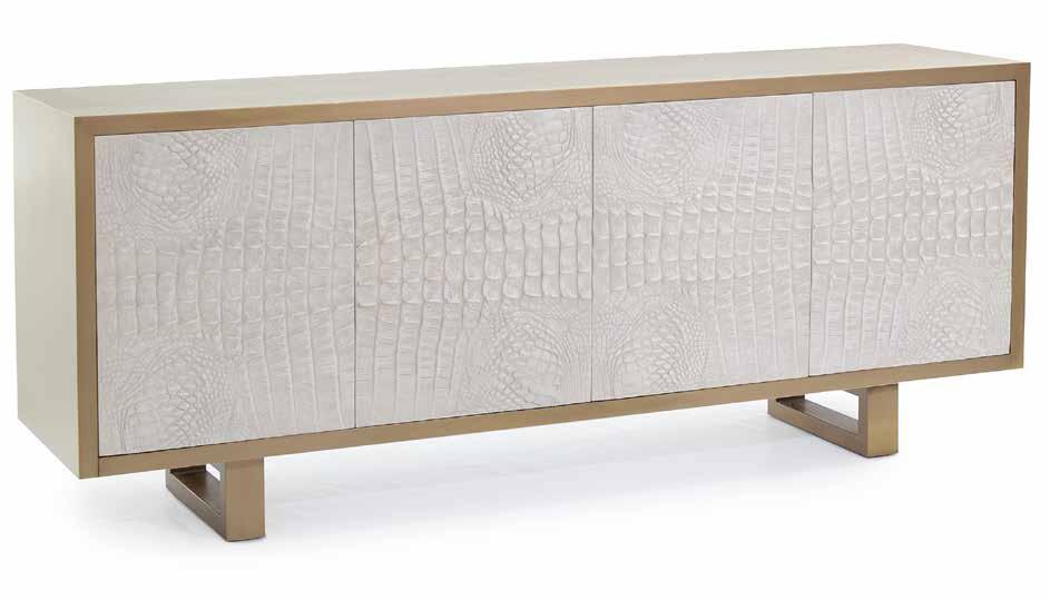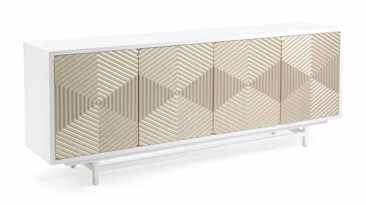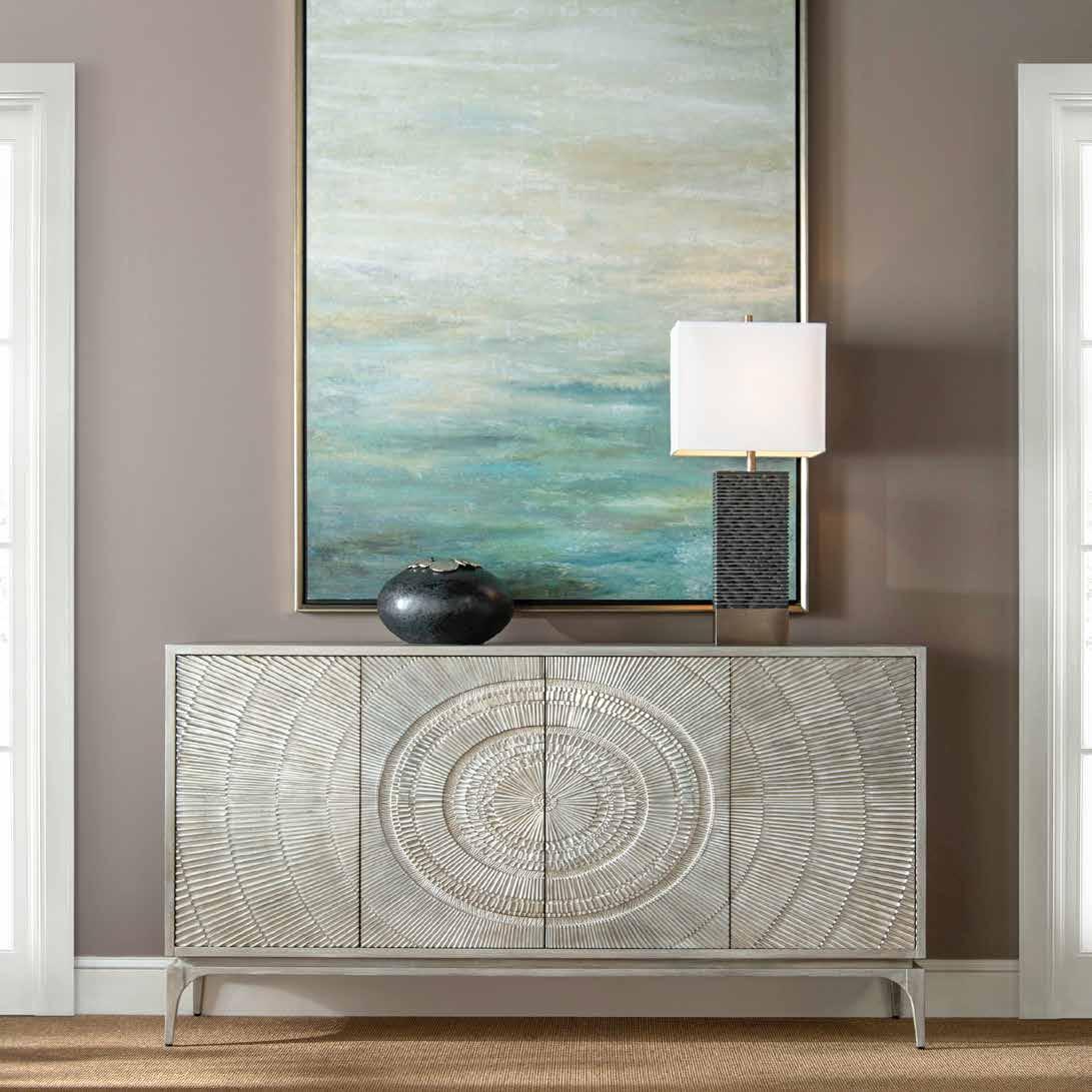 The Solstice Sideboard features a detail from the original work printed on burlap across the five door fronts. The case is inlaid and finished in white linen, and an inwardly chamfered molding in Mayan gold frames the printed front. The cabinet stands on four aluminum bracket feet finished in Mayan gold. There is an adjustable shelf behind the doors.