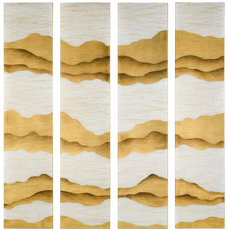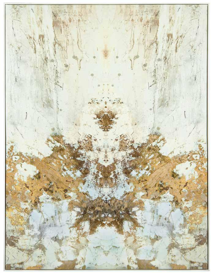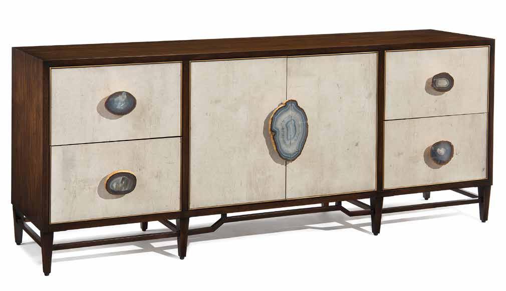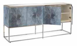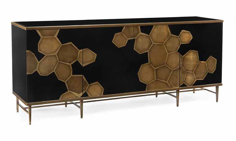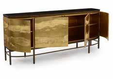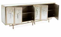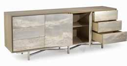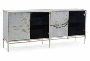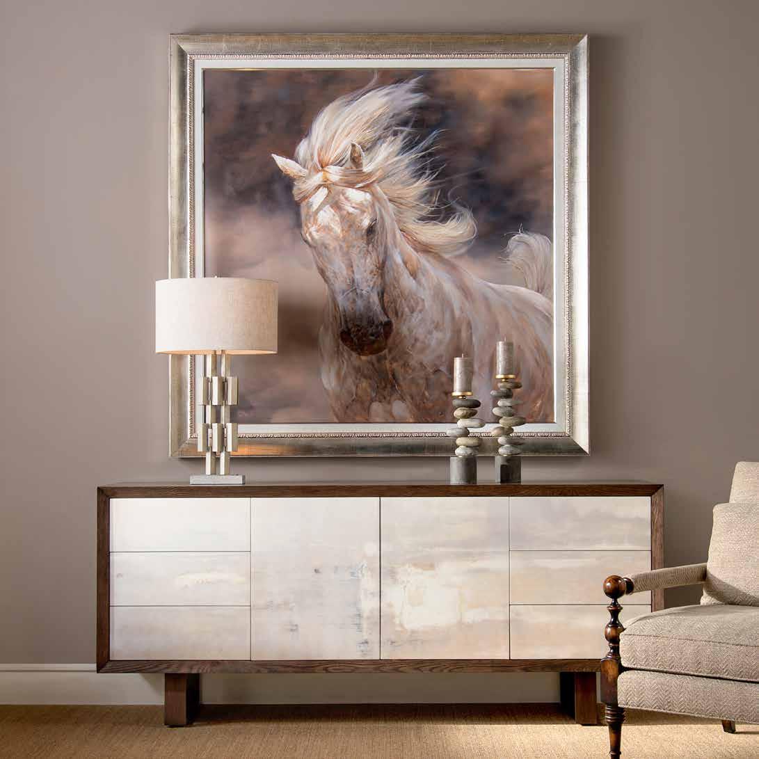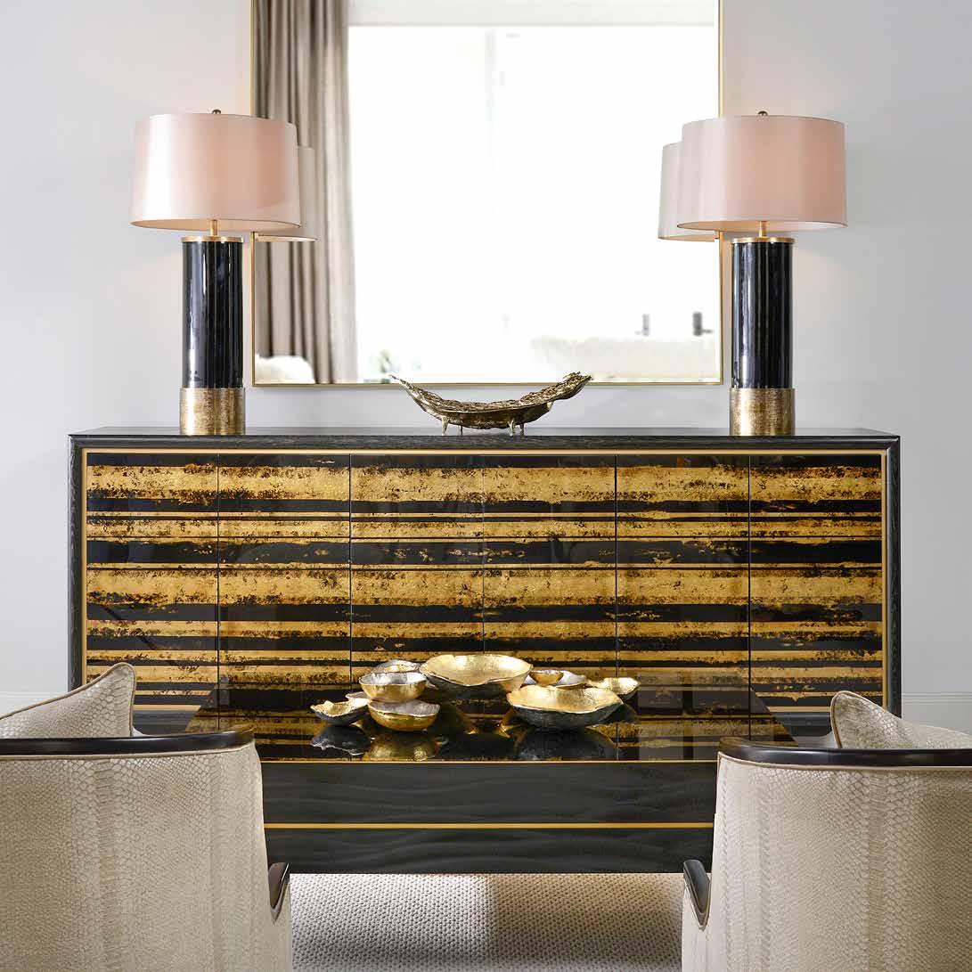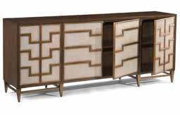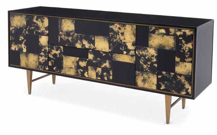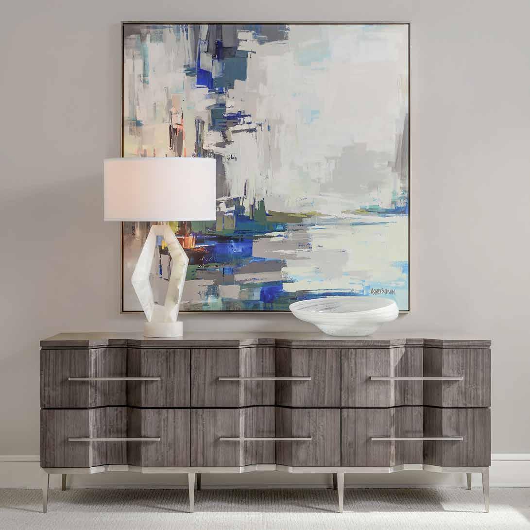 The Solstice Sideboard features a detail from the original work printed on burlap across the five door fronts. The case is inlaid and finished in white linen, and an inwardly chamfered molding in Mayan gold frames the printed front. The cabinet stands on four aluminum bracket feet finished in Mayan gold. There is an adjustable shelf behind the doors.