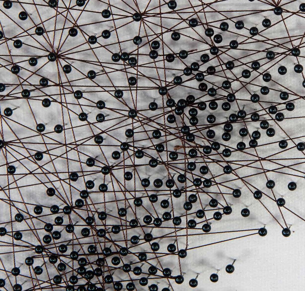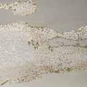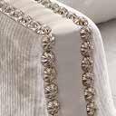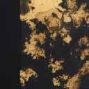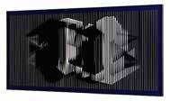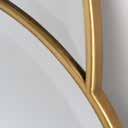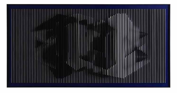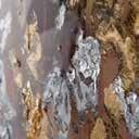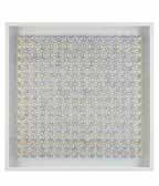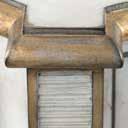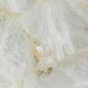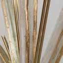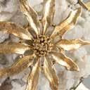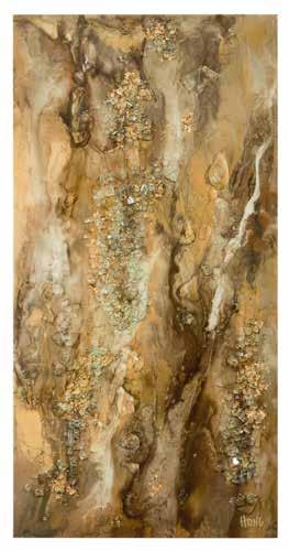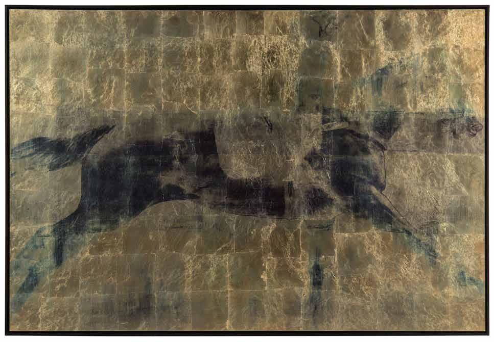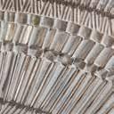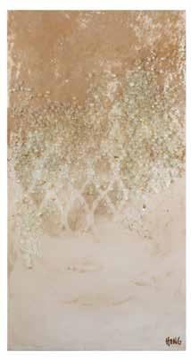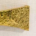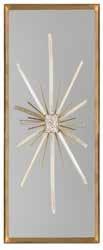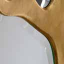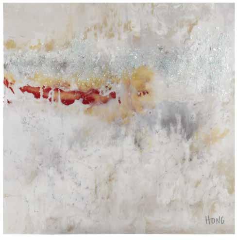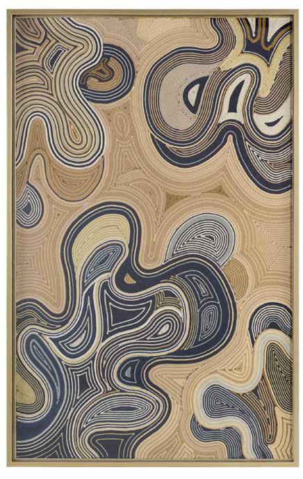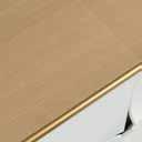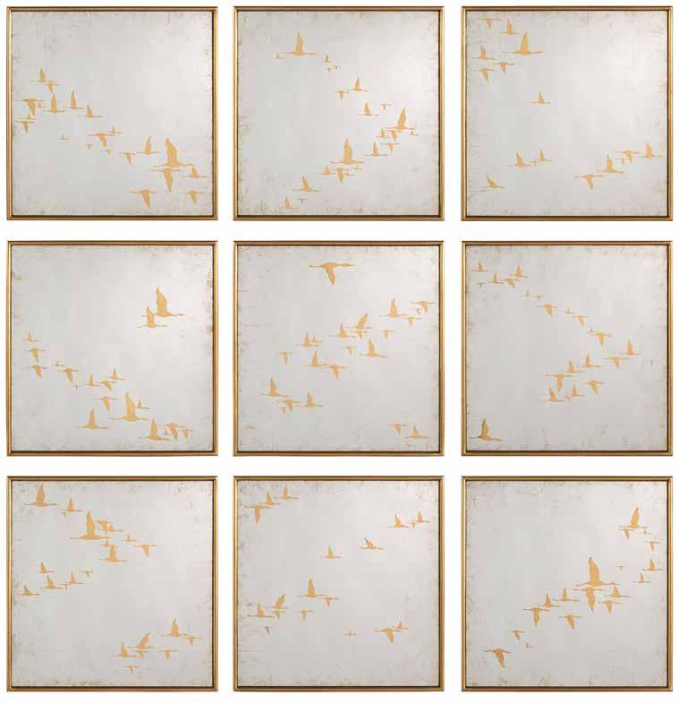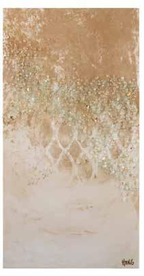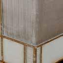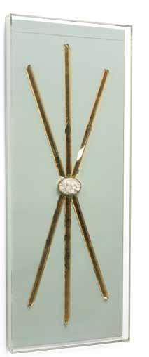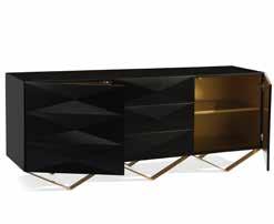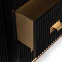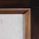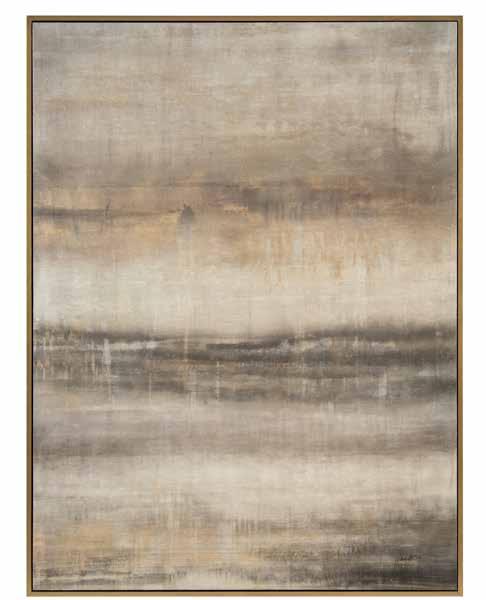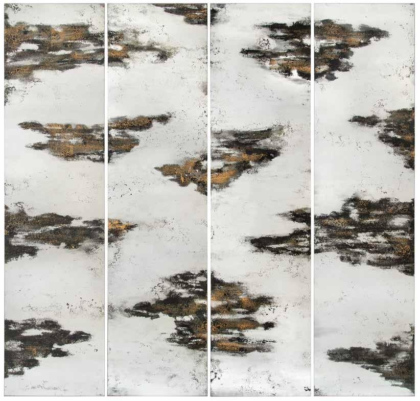 The Solstice Sideboard features a detail from the original work printed on burlap across the five door fronts. The case is inlaid and finished in white linen, and an inwardly chamfered molding in Mayan gold frames the printed front. The cabinet stands on four aluminum bracket feet finished in Mayan gold. There is an adjustable shelf behind the doors.