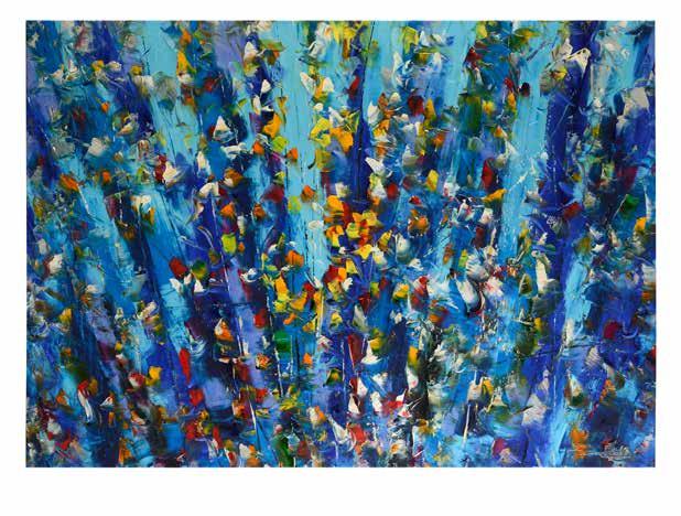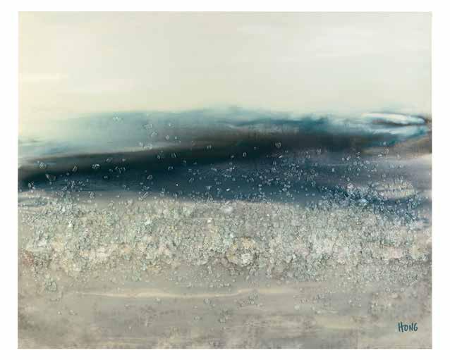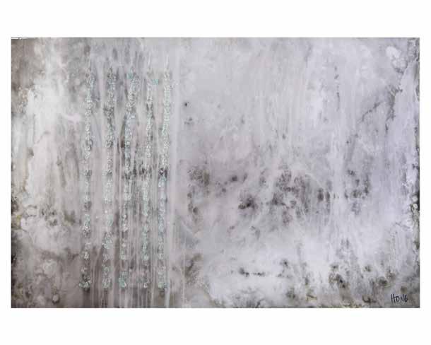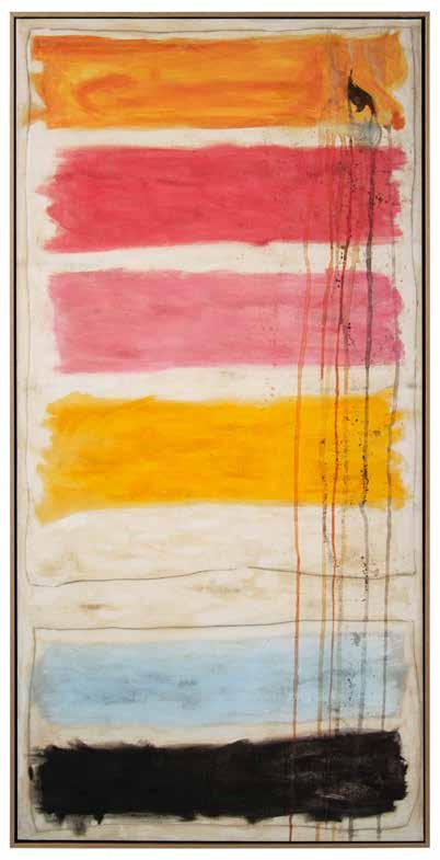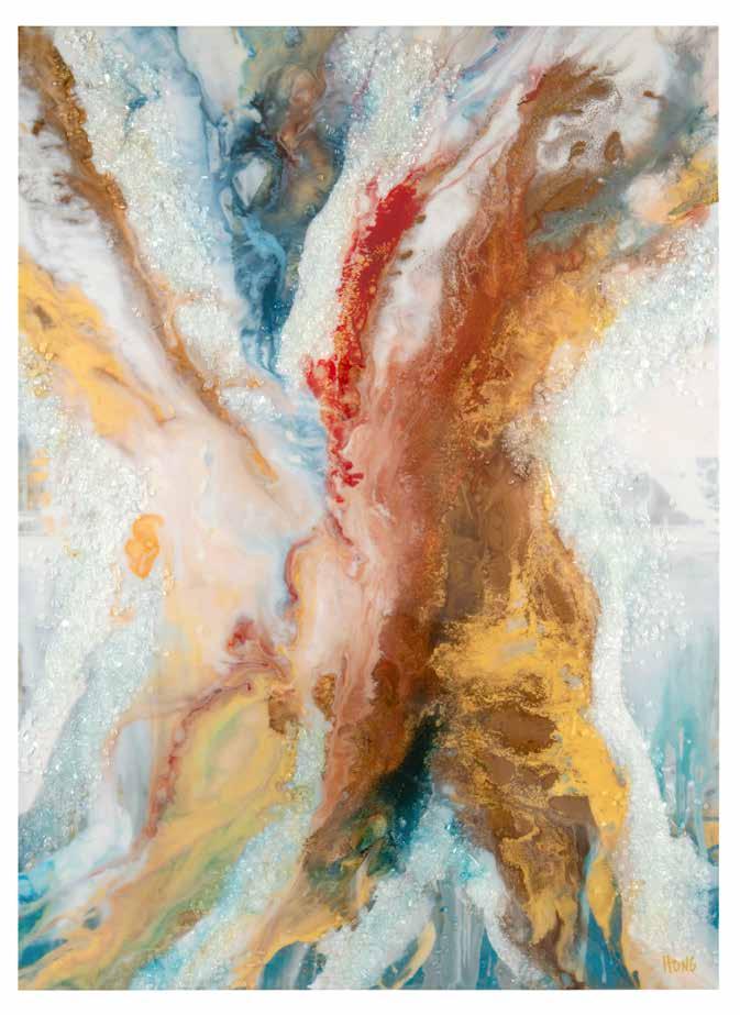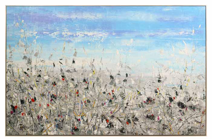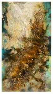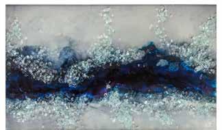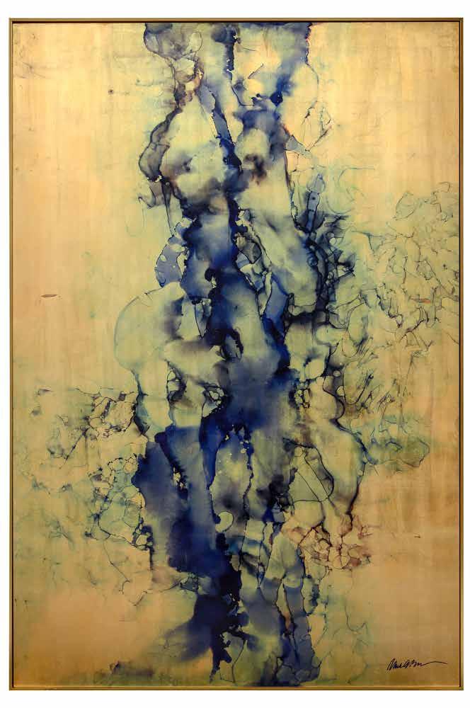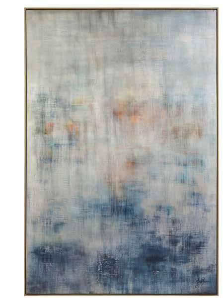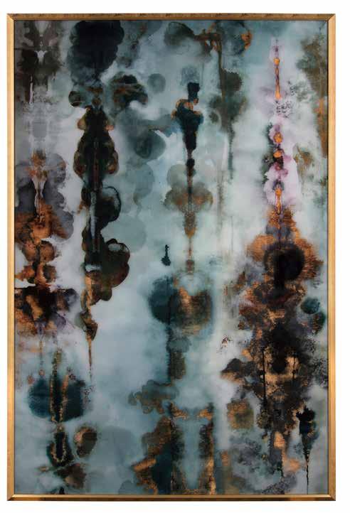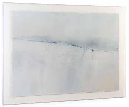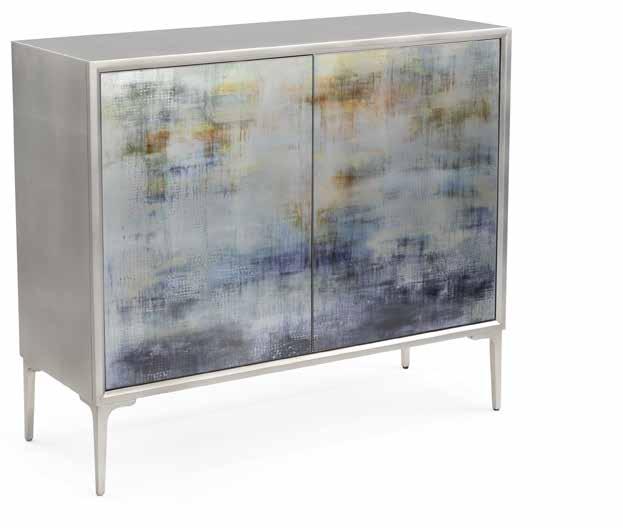 Haze, a stunning painting by esteemed abstract artist Carol Benson-Cobb, is featured on the door fronts of this cabinet. The cabinet sits on a steel base with tapered legs finished in silver. The moldings surrounding the églomisé panels to the top and sides are also finished in silver.