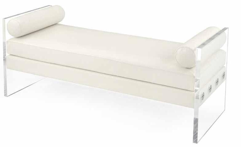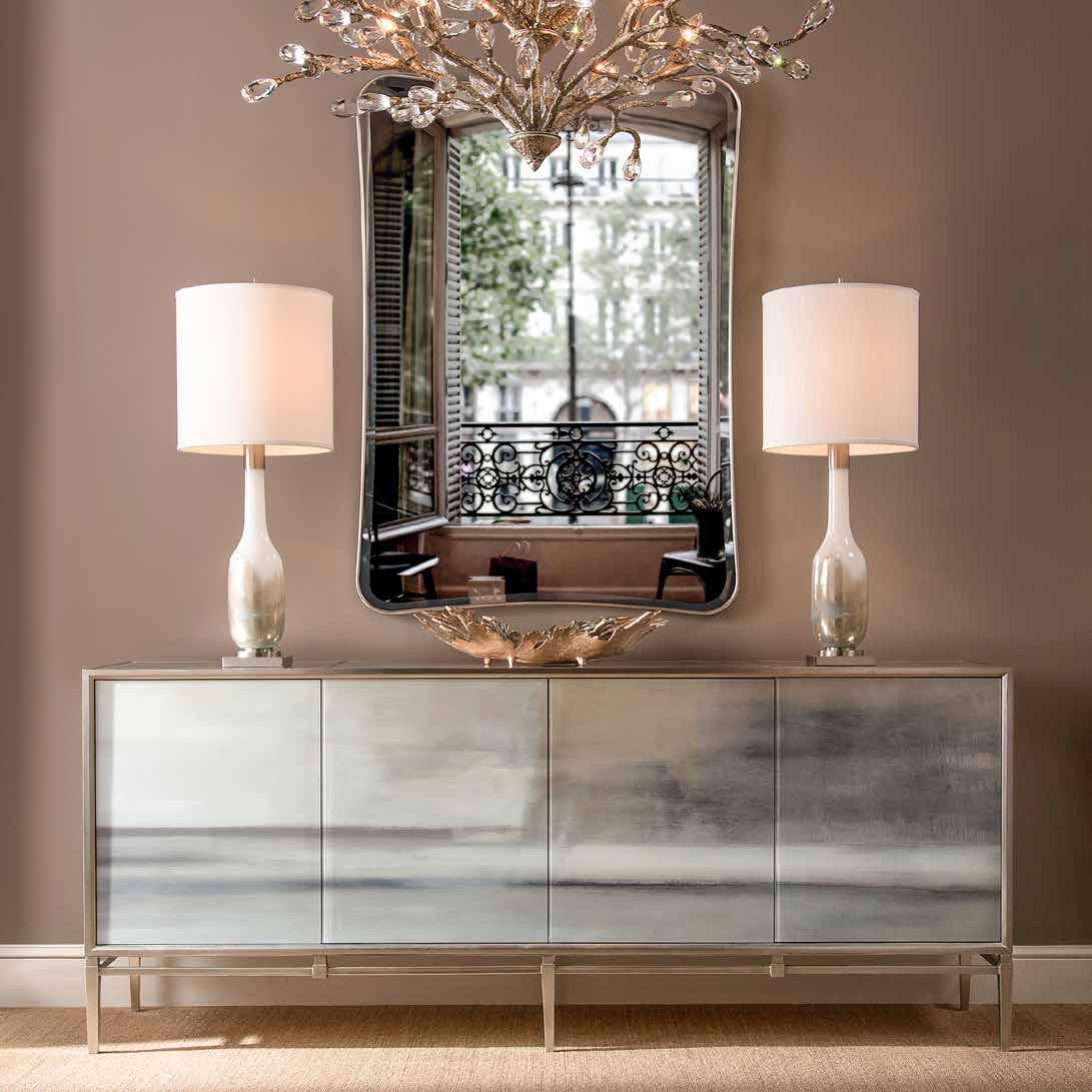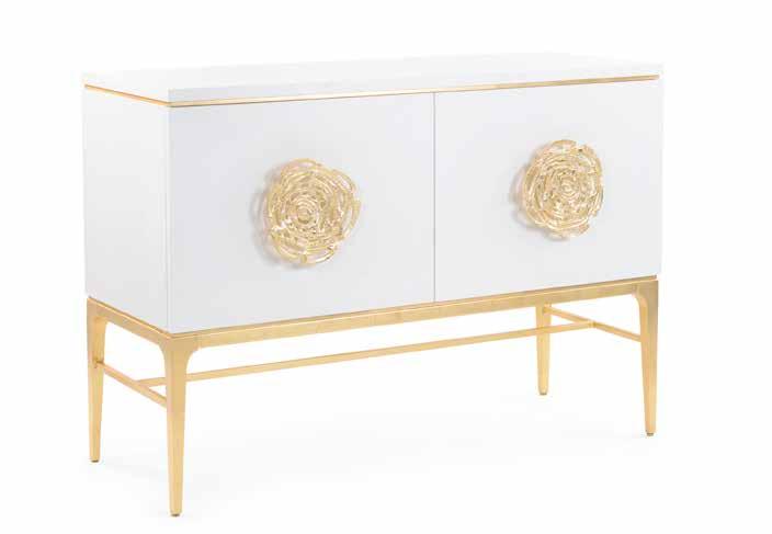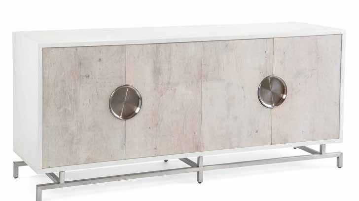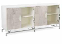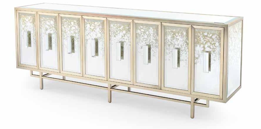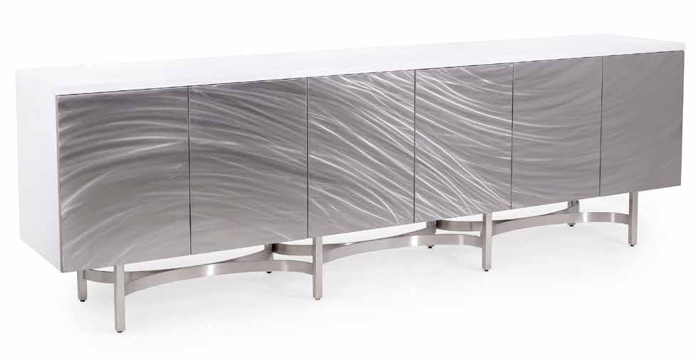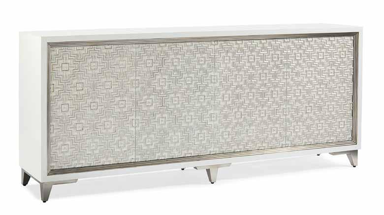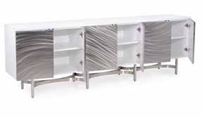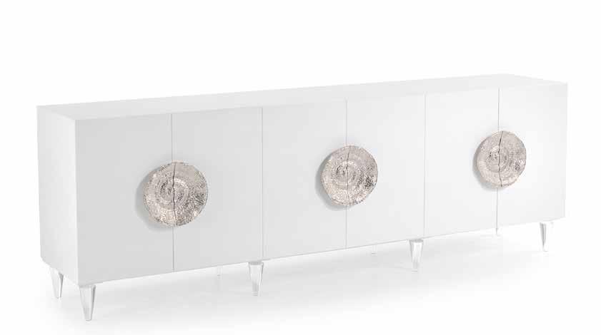 Standing on turned acrylic legs and finished in ice white, this six-door credenza has bold, silvered escargot handles on each pair of doors. Soft-closing hinges are fitted, and adjustable shelves finish out the interior.