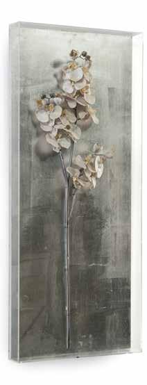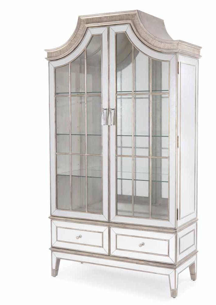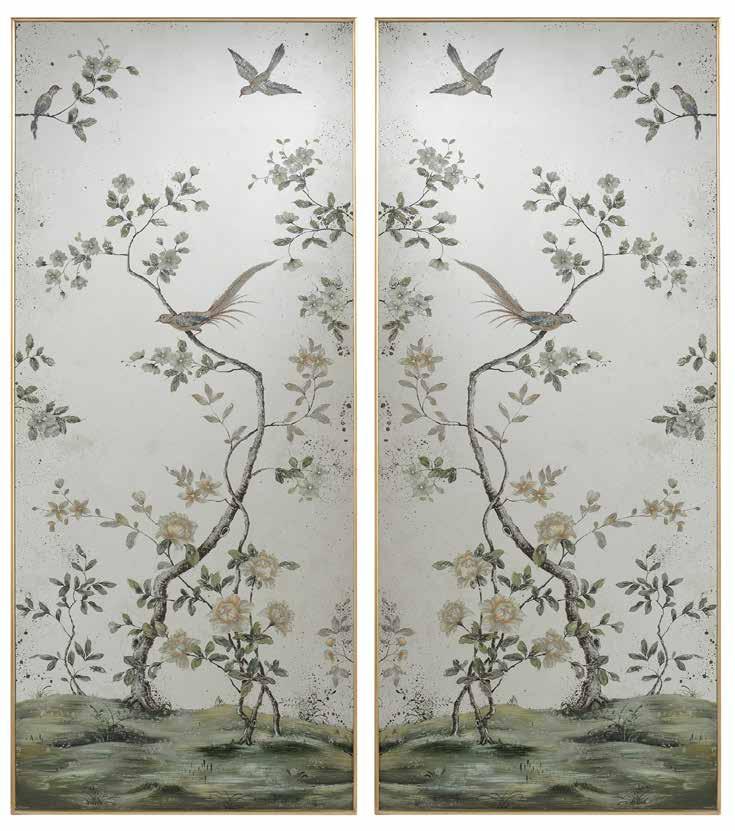 Pewter silver moldings frame reverse-printed glass panels of Spring Rain, an image by artist Shaye Rawson, that run across the face, sides, and plinth of this statement piece. The top is in three panels of modern mirror, and the steel base is in pewter silver. Push-latches are fitted. Adjustable shelves complete the interior.