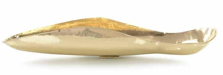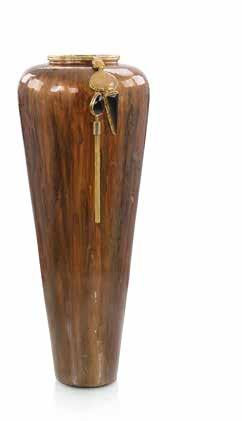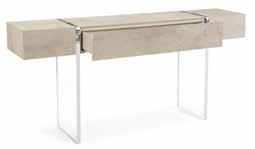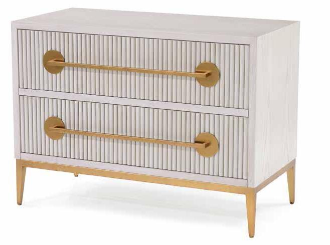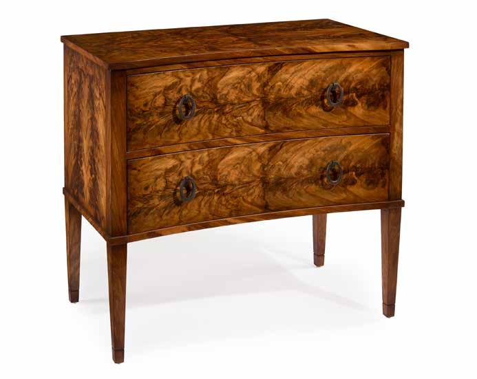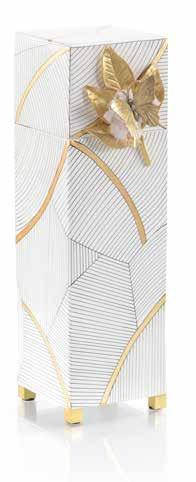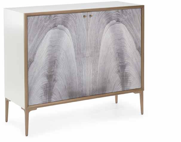 The case in quartered ash veneer is finished in beluga and sits on a steel base in a natural gold finish. The decorative cast handles in gold have a wash of pearlized acrylic resin. Soft-closing hinges are fitted throughout, and a single adjustable shelf completes the interior.