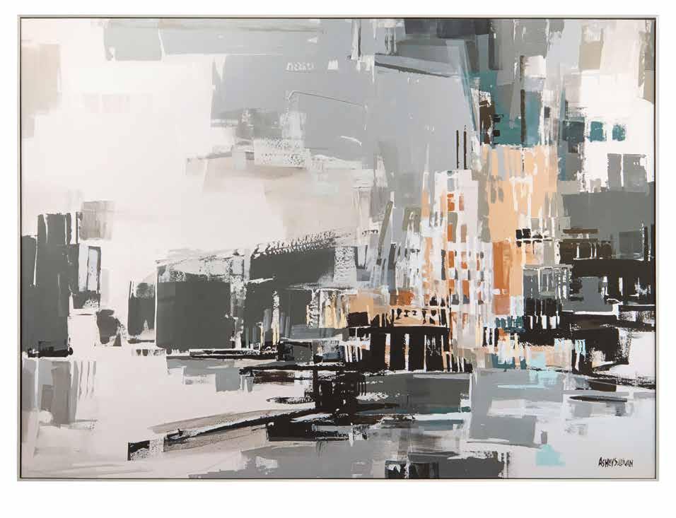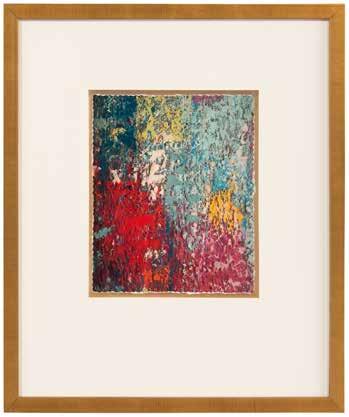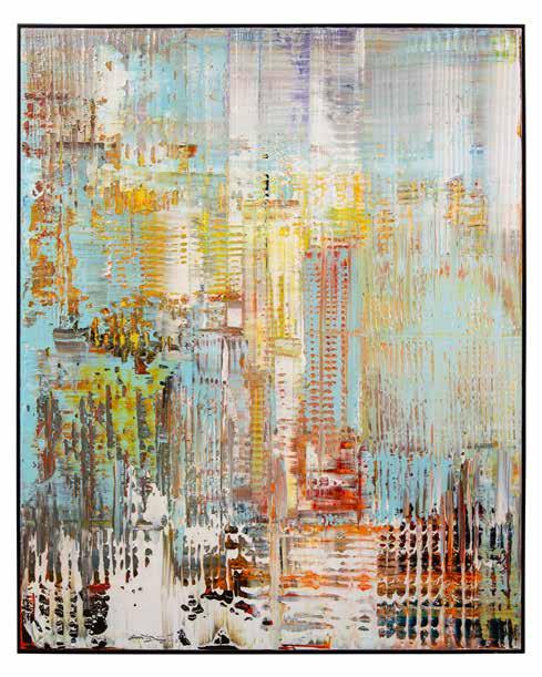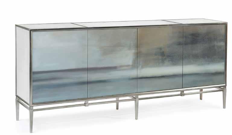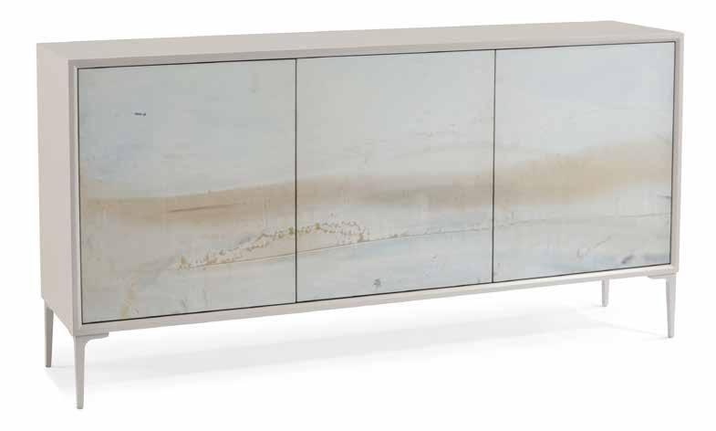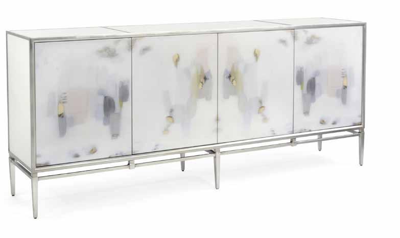 Slated, a stunning painting by esteemed abstract artist Carol Benson-Cobb, is featured on the door fronts of this credenza. The cabinet sits on a steel base with tapered legs finished in silver. The moldings surrounding the églomisé panels to the top and sides are also finished in silver.