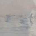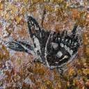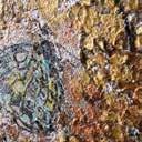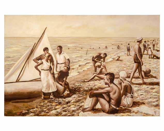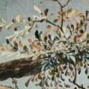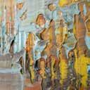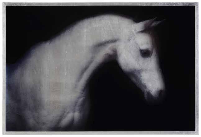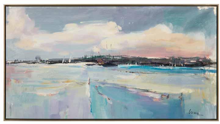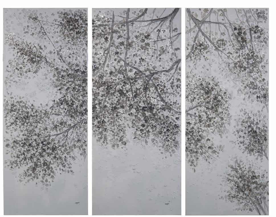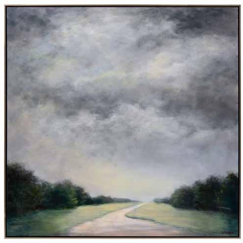 This three-door credenza in flat oak veneer is finished in driftwood and has solid oak feet. The front of this piece is printed with a reproduction of Carol Benson-Cobb's painting Enigma. The doors are fitted with push-latches, and there are adjustable shelves behind them.