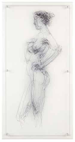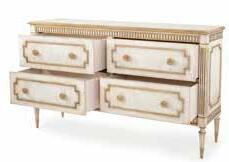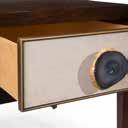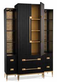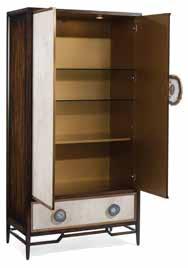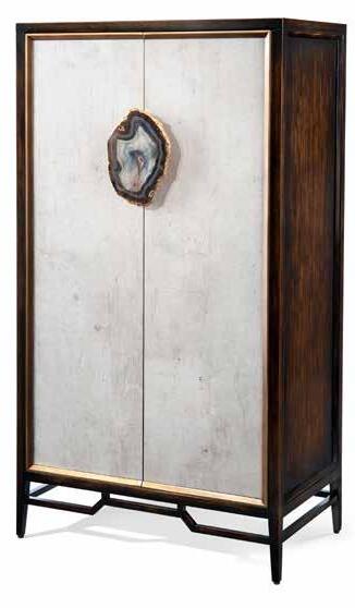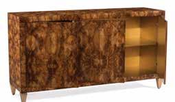 The case in quartered ash veneer is finished in beluga and sits on a steel base in a natural gold finish. The decorative cast handles in gold have a wash of pearlized acrylic resin. Soft-closing hinges are fitted throughout, and adjustable shelves complete the interior.