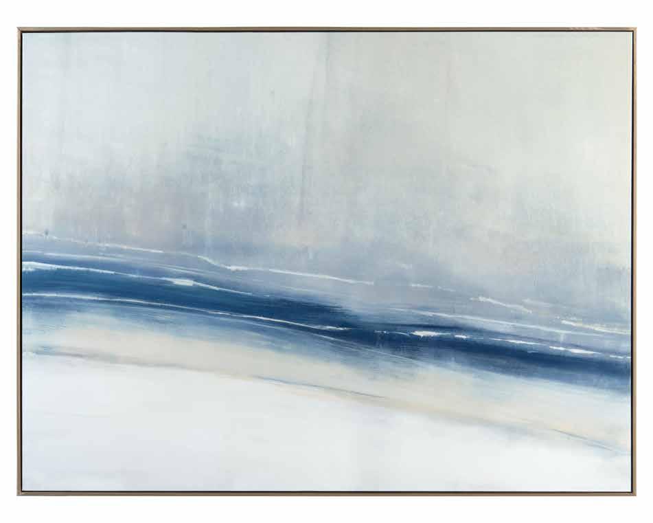 This four-door sideboard features artwork landscaped across the linen door fronts. The case is also wrapped in linen, finished in indigo batik, and sits upon a steel base in a brushed brass finish. Two small finger pulls in brushed brass are fitted to the center doors, with push-latches fitted to the outer doors.