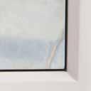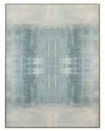 This two-door cabinet in light grey features a giclée of Soft Blue River by Austin Allen James across the doors, each with push-latch mechanisms. The metal legs are in a matching light grey finish. The cabinet interior is fitted with a single adjustable shelf.