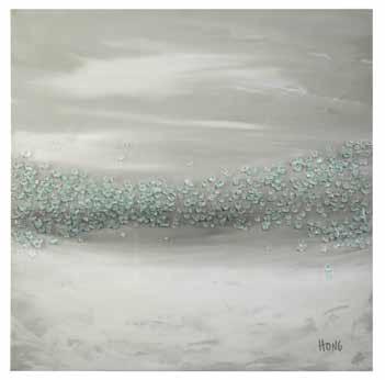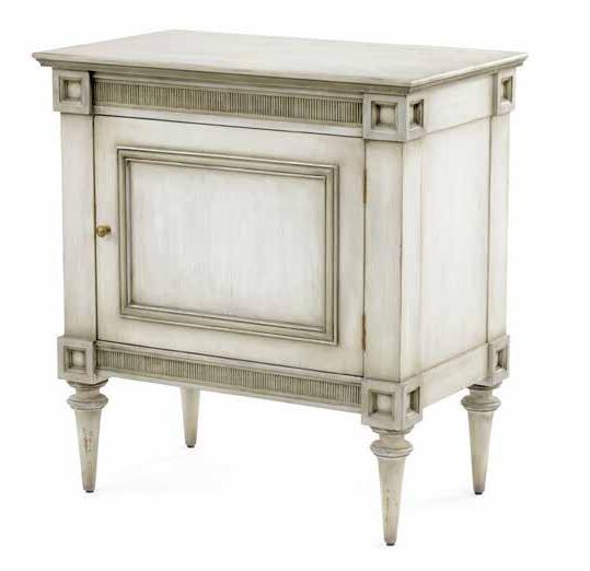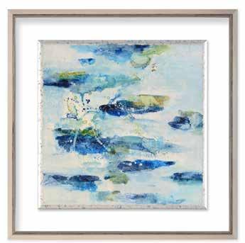 This commode features reverse-printed glass panels of Spring Rain, an image by artist Shaye Rawson, on its two doors. The case is finished in pewter silver and sits on four bracket legs. Push-latches are fitted to the doors. An adjustable shelf completes the interior.