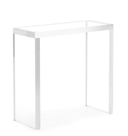 Standing on turned acrylic legs and finished in ice white, this four-door credenza has bold, silvered escargot handles on each pair of doors. Each cupboard has one adjustable shelf.