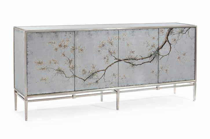 This sideboard features an original work of Oriental art printed on rice paper and inlaid across the four doors. The cabinet is in oak and finished in grey driftwood. The steel frame feet and handles are finished in silver white. There is an adjustable shelf behind the doors, and soft-closing hinges are fitted.