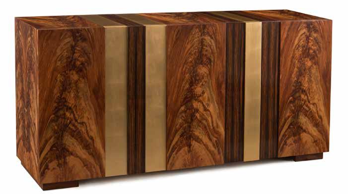 Veneered and finished in smoky hyedua, the front of this impressive sideboard features a single print of an exotic crotch veneer. Glazing is applied by hand before a final clear lacquer. The case is set on a steel base in a brushed brass finish. The three drawers and three doors are fitted with push-latches. Adjustable shelves complete the interior.