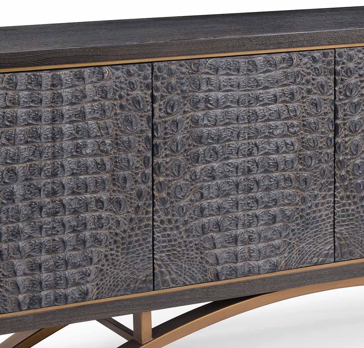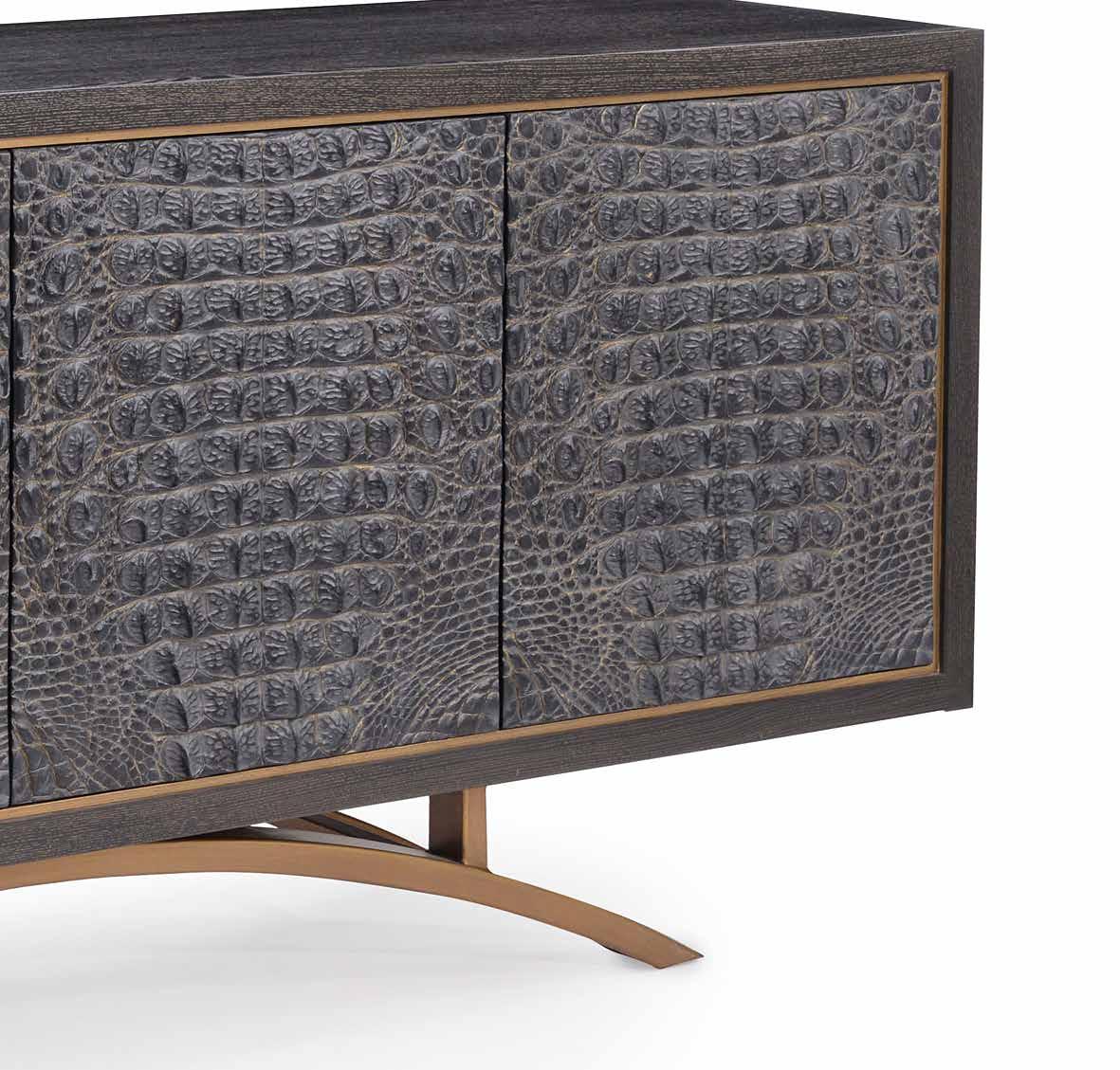 Veneered in ash and finished in antique beluga, the front of this impressive credenza features individual prints of an exotic crotch veneer. Glazing is applied by hand before a final clear lacquer. The case is set on a steel base in a brushed brass finish, with a front molding to match. The doors are fitted with push-latches, and adjustable shelves complete the interior.