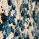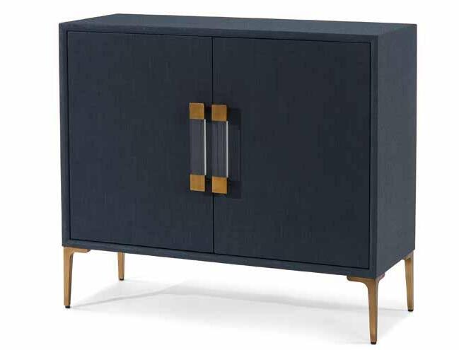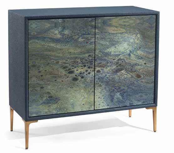 This two-door cabinet is inlaid in linen and finished in indigo batik. A fragmented segment of Soft Blue River by Austin Allen James covers the two doors, which are each fitted with soft-closing hinges and bar handles in a polished brass finish. The metal legs are in a goldleaf finish, and the cabinet interior is fitted with a single adjustable shelf.