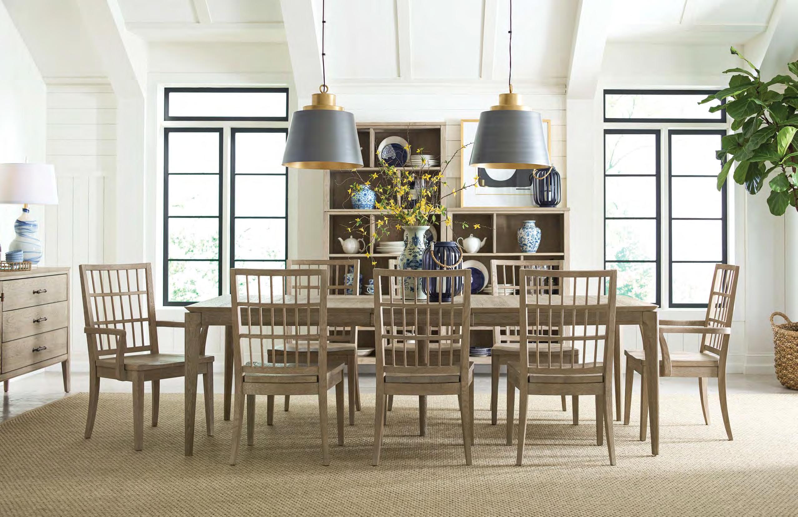 Above (larger): 939-760 Summit Large Dining Table, 939-639 Symmetry Wood Arm Chair, 939-638 Symmetry Wood Side Chair, 939-850 Asymmetry Cabinet Large