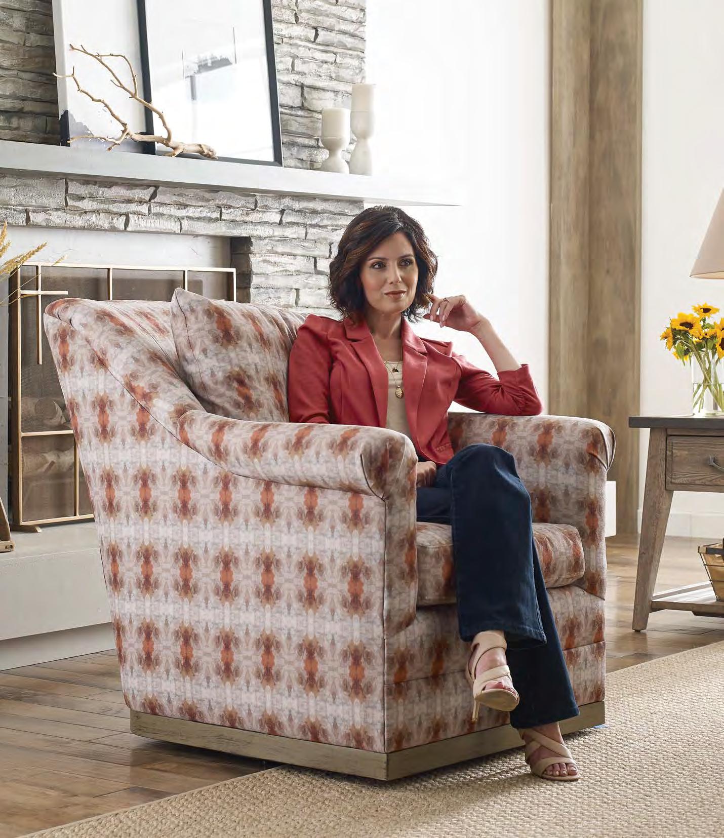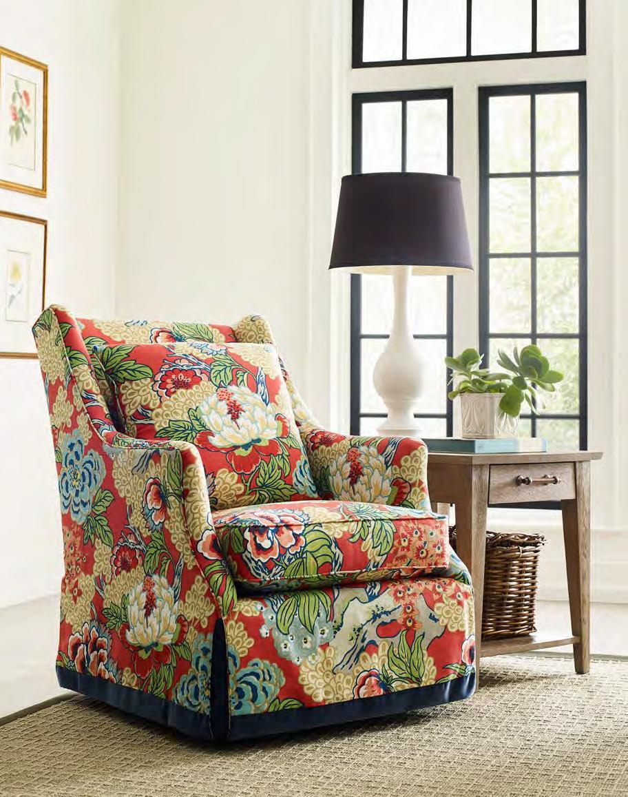Above: Juliette Swivel Glider 012-02 body fabric: Honshu Coral; pillow shown in Honshu Coral fabric Shown with Kincaid Symmetry Collection table