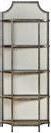 Metal frame. Upholstered back panel with nail trim. Five wood shelves. Blended linen.