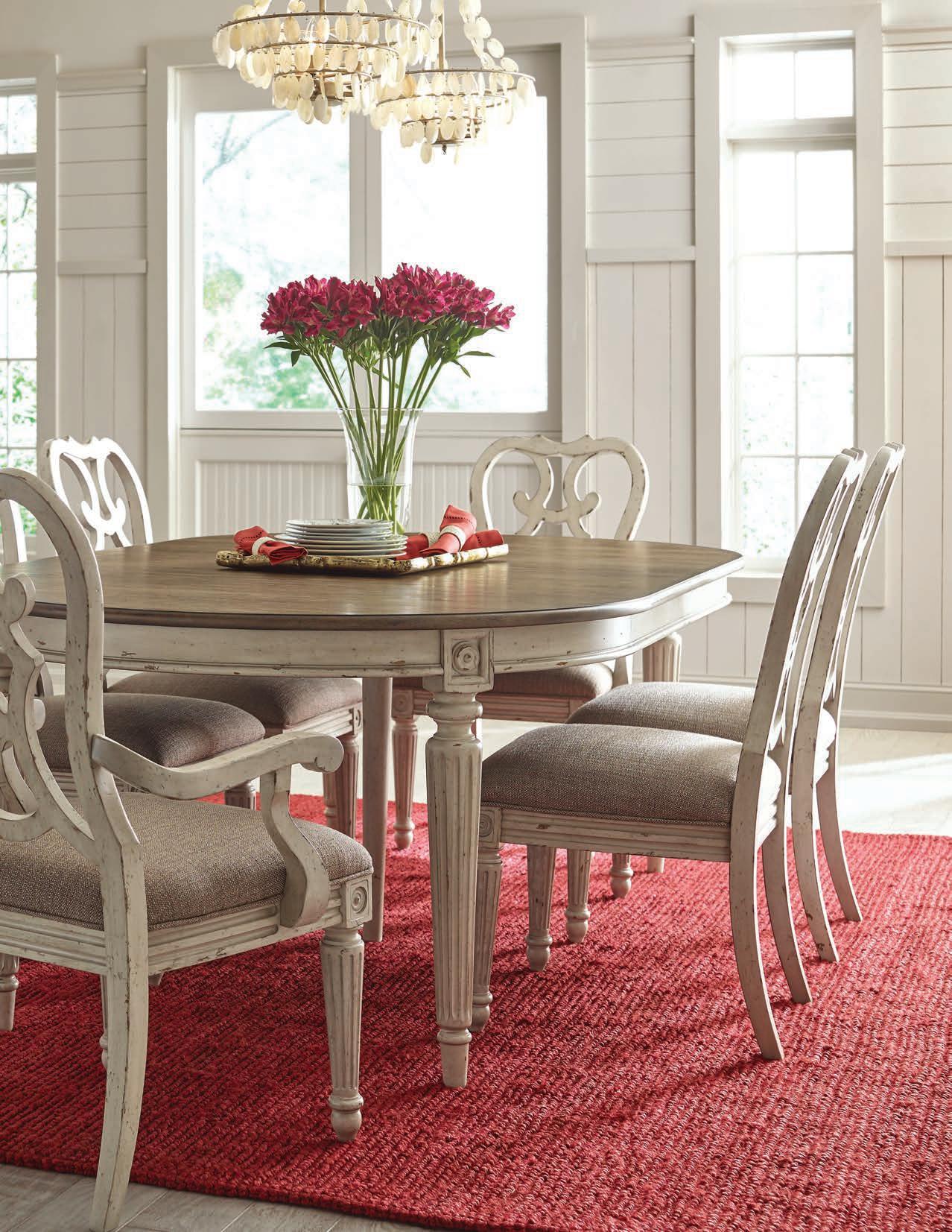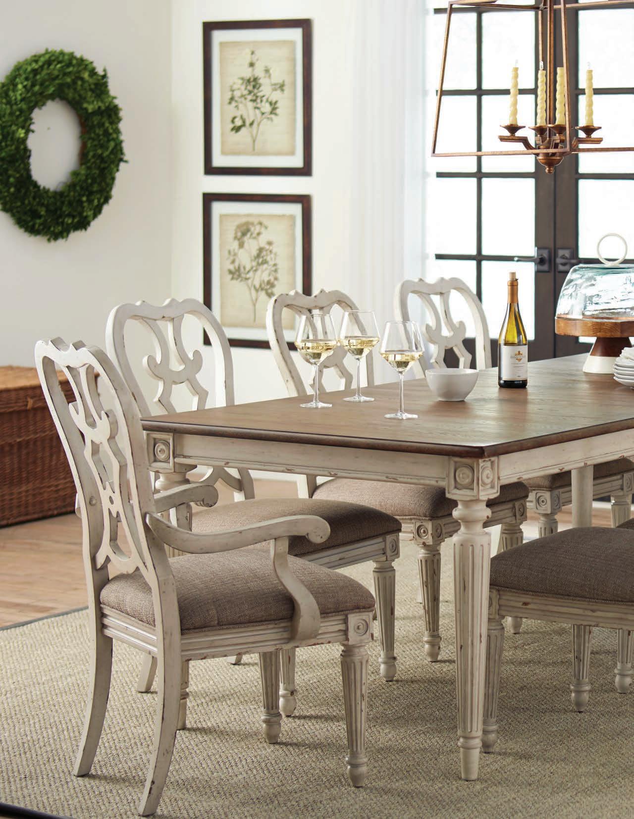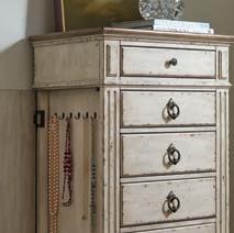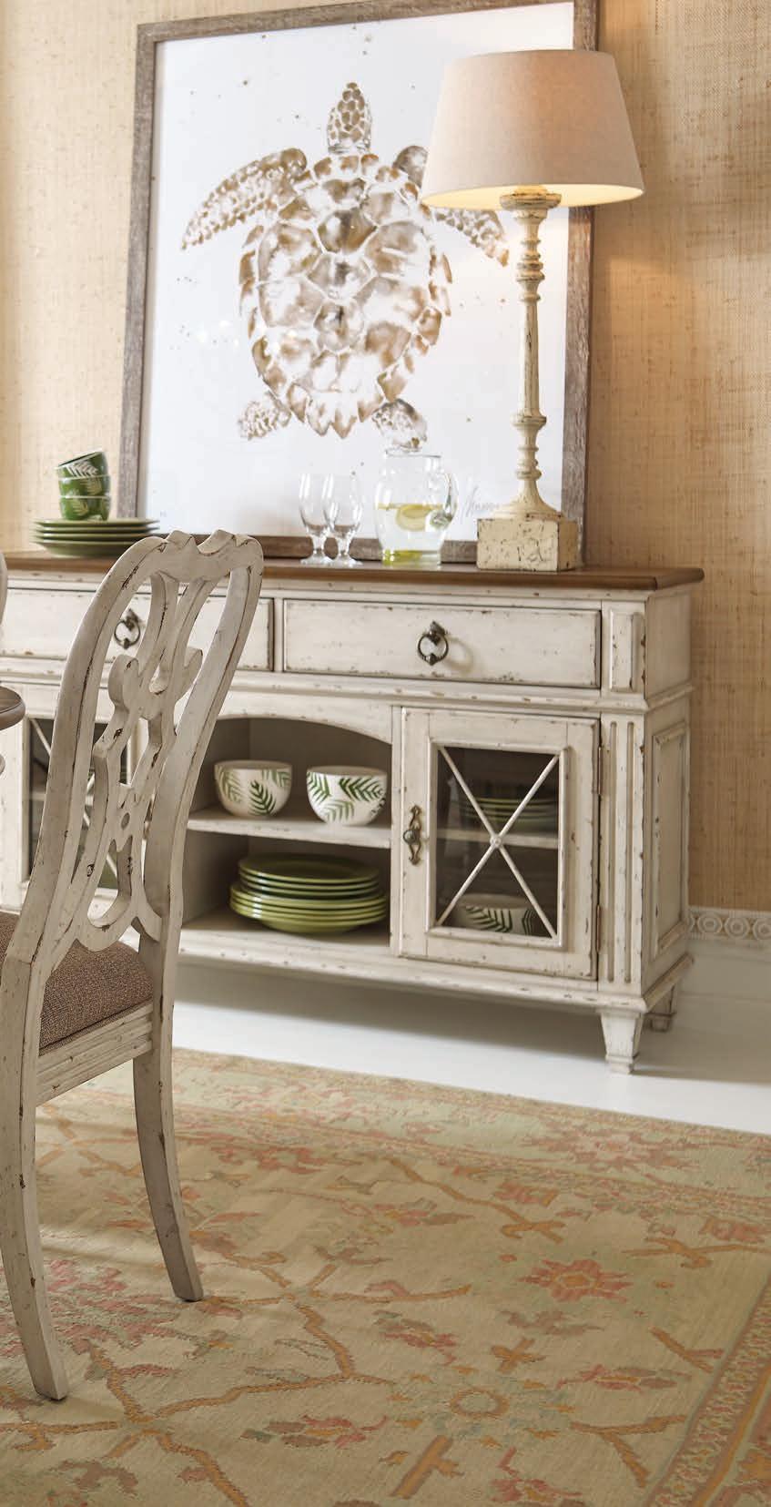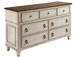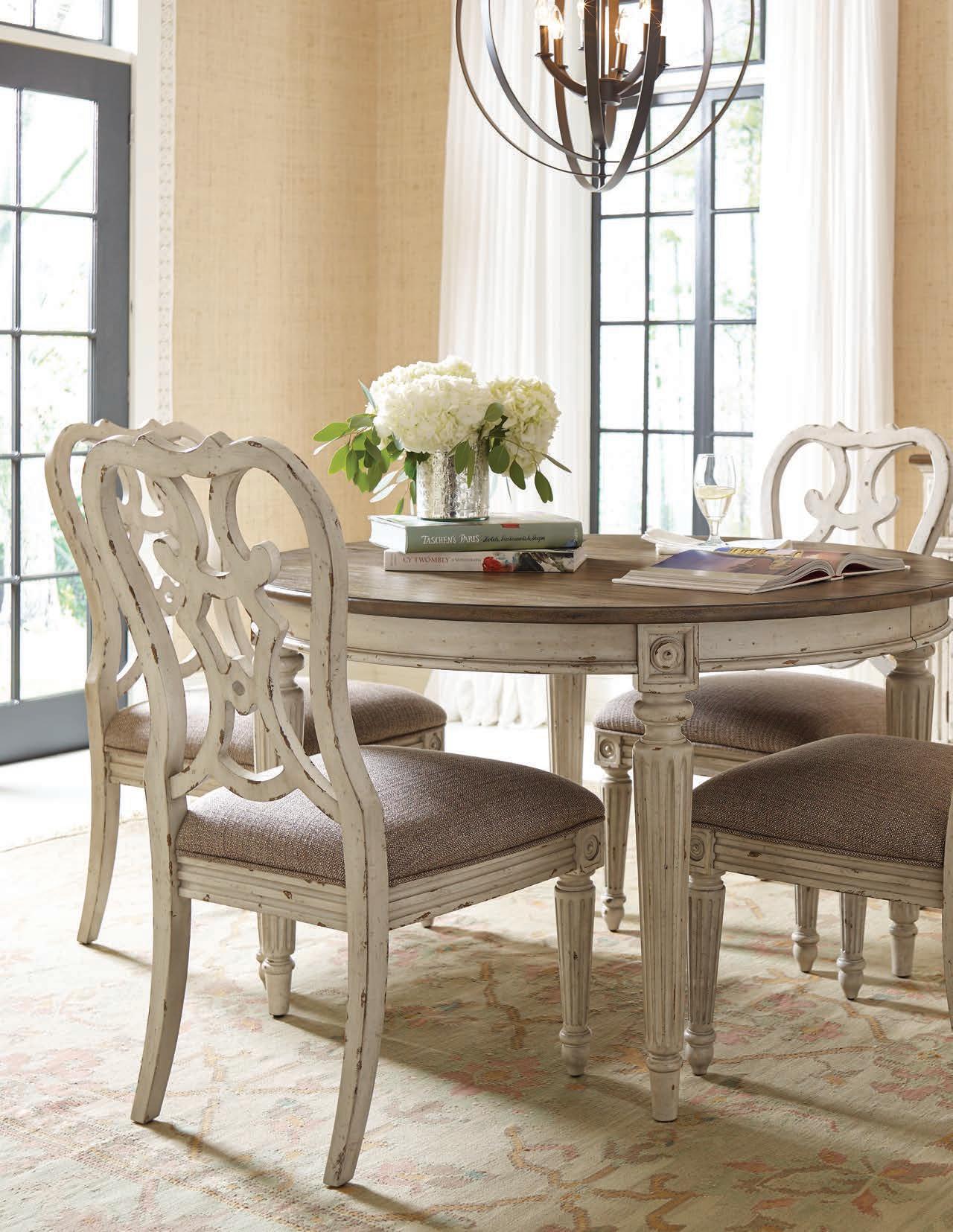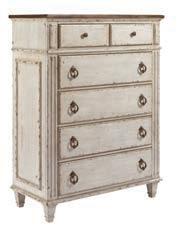 Casual European country homes are the inspiration for Southbury. Working with different textures and finishes create a look and feel of old world treasures. Design inspirations include architectural elements such as fluted posts, picture frame moldings, subtle shapes and tapered legs. The final touch of the case is the beautiful dropring hardware. To achieve a time worn look, we use Wirebrushed Oak veneers finished with a glaze over antiqued chipped paint . Bedroom features include: soft close drawer guides, a flip down pullout drawer for component storage and a lingerie chest with hidden storage. Southbury offers flexible dining room pieces that can fit into many areas, such as the 50” round table that will seat 4-8 people comfortably. A graceful dining chair with beautiful turned and fluted legs with a scroll back and an upholstered seat adds comfort and style to any home decor.
