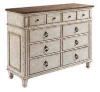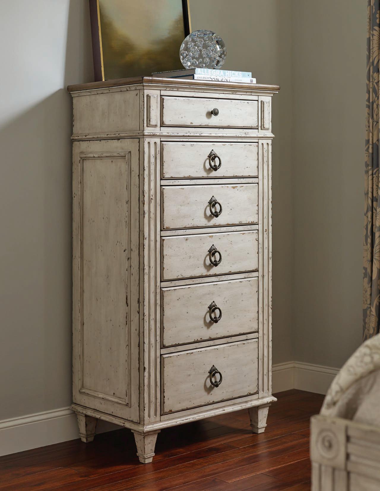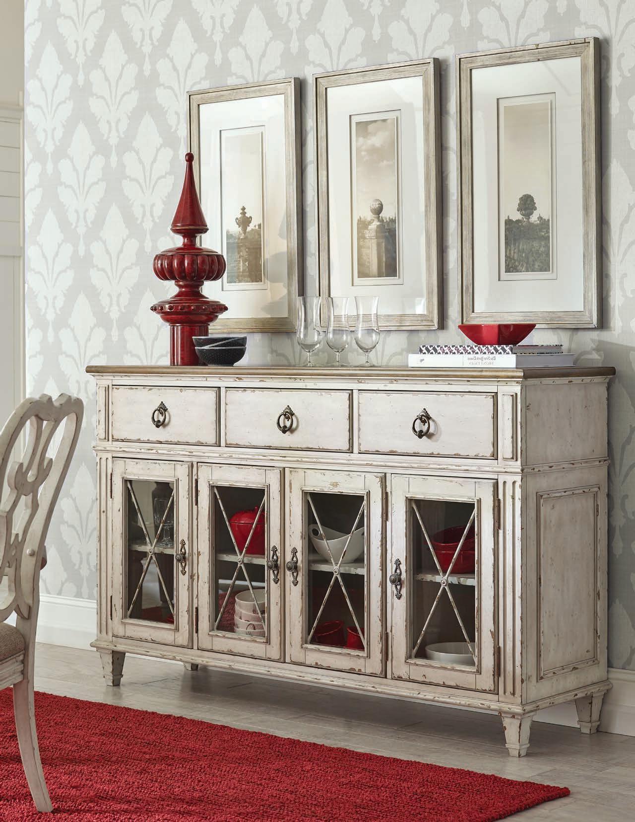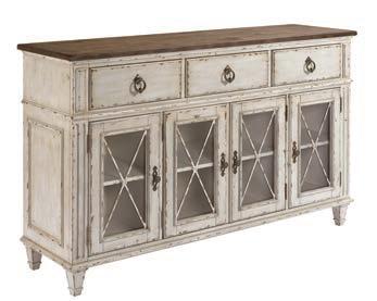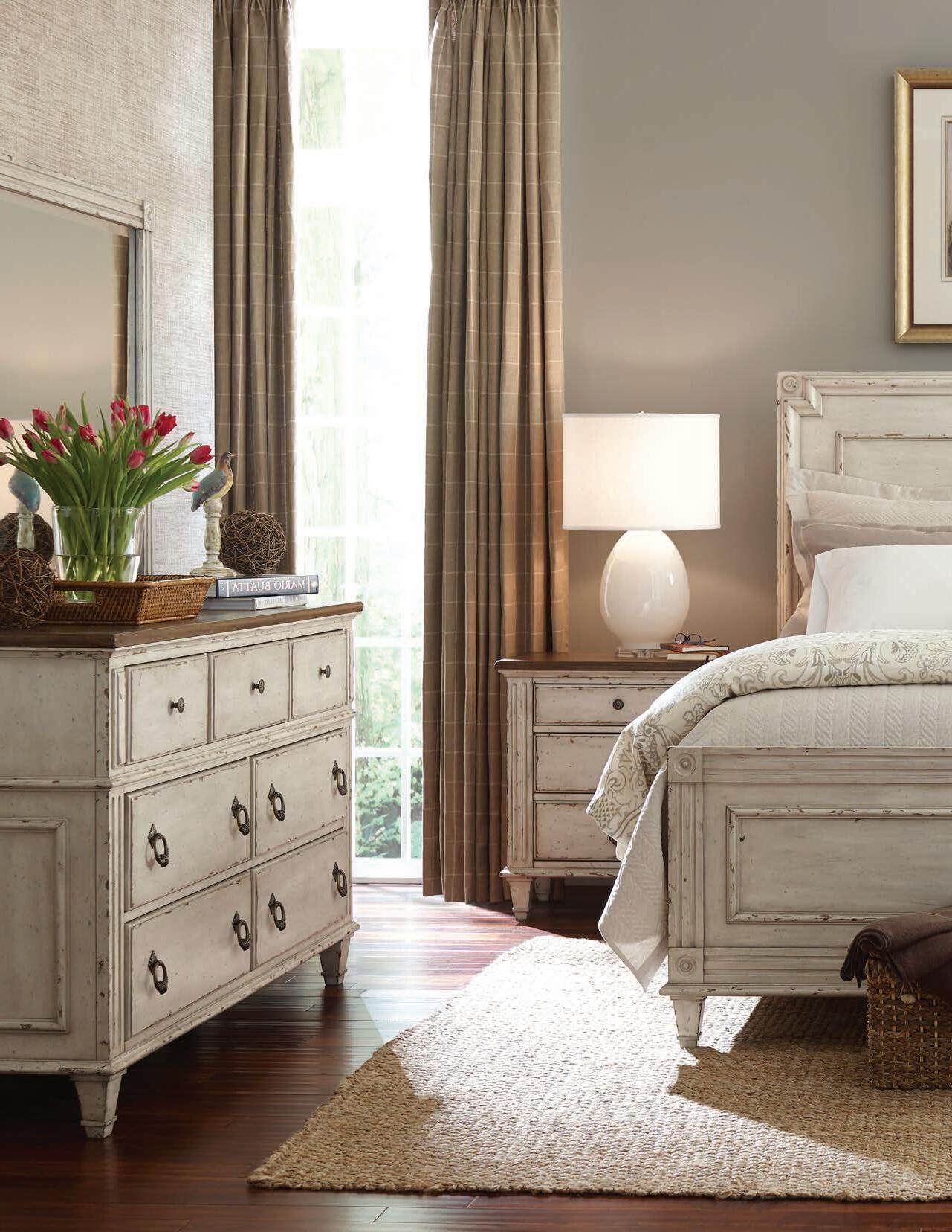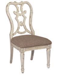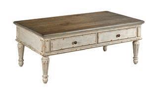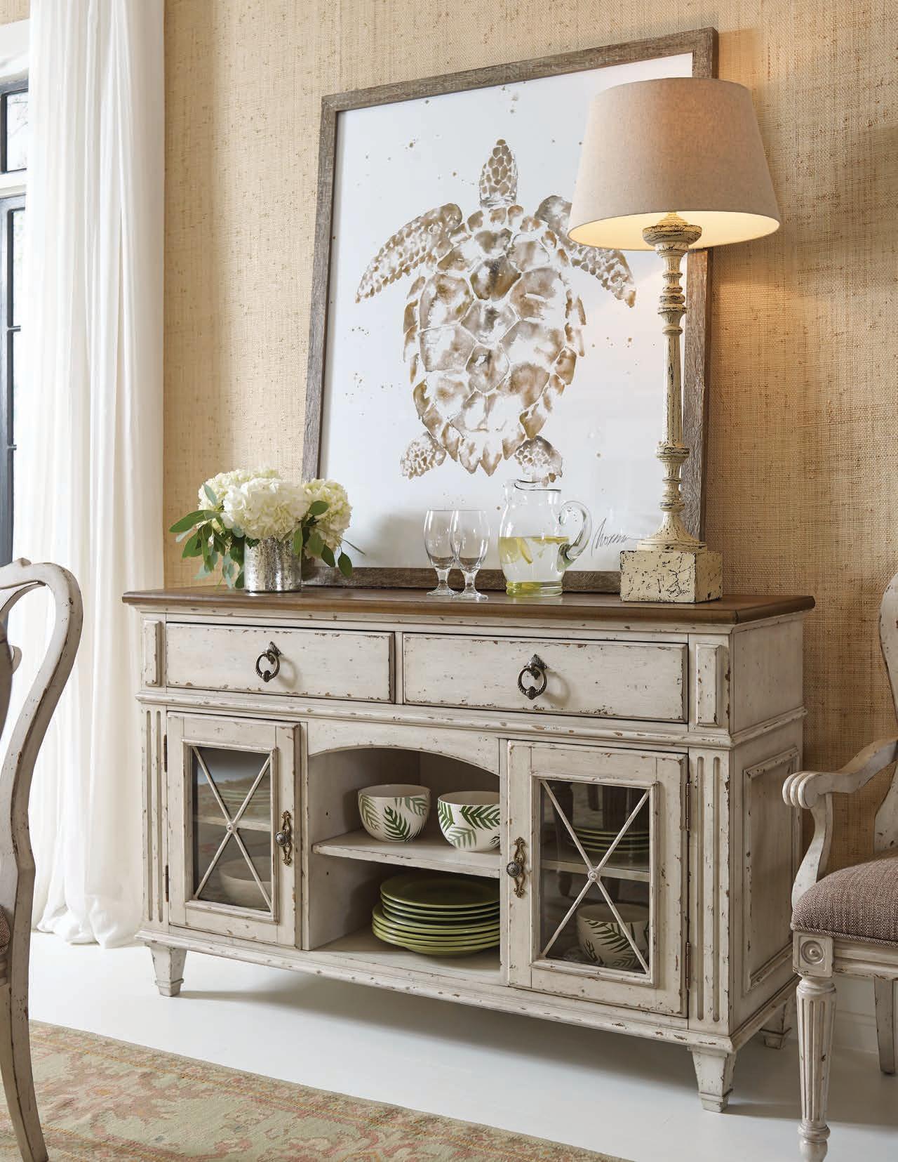 Casual European country homes are the inspiration for Southbury. Working with different textures and finishes create a look and feel of old world treasures. Design inspirations include architectural elements such as fluted posts, picture frame moldings, subtle shapes and tapered legs. The final touch of the case is the beautiful dropring hardware. To achieve a time worn look, we use Wirebrushed Oak veneers finished with a glaze over antiqued chipped paint . Bedroom features include: soft close drawer guides, a flip down pullout drawer for component storage and a lingerie chest with hidden storage. Southbury offers flexible dining room pieces that can fit into many areas, such as the 50” round table that will seat 4-8 people comfortably. A graceful dining chair with beautiful turned and fluted legs with a scroll back and an upholstered seat adds comfort and style to any home decor.