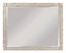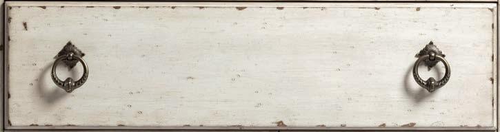 Wirebrushed Oak veneers featuring white parchment finish with glaze and antique chipped paint along with contrasting fossil-colored wood tone tops and soft close drawer guides